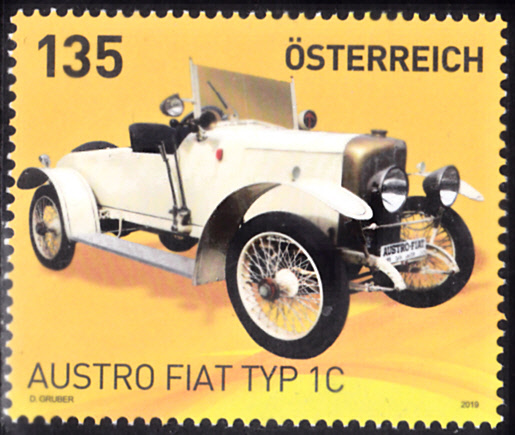 Auf dieser Marke aus Österreich (MiNr 3444) ist ein Zweisitzer vom Typ 1C, Baujahr 1913, ein Stadt- und Tourenwagen von Austro Fiat abgebildet. Von diesem sind nur noch wenige Exemplare erhalten.