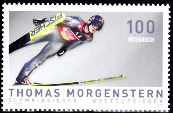 Auf dieser Marke aus Österreich (MiNr 2777) sehen wir Thomas Morgenstern beim Skisprung.
