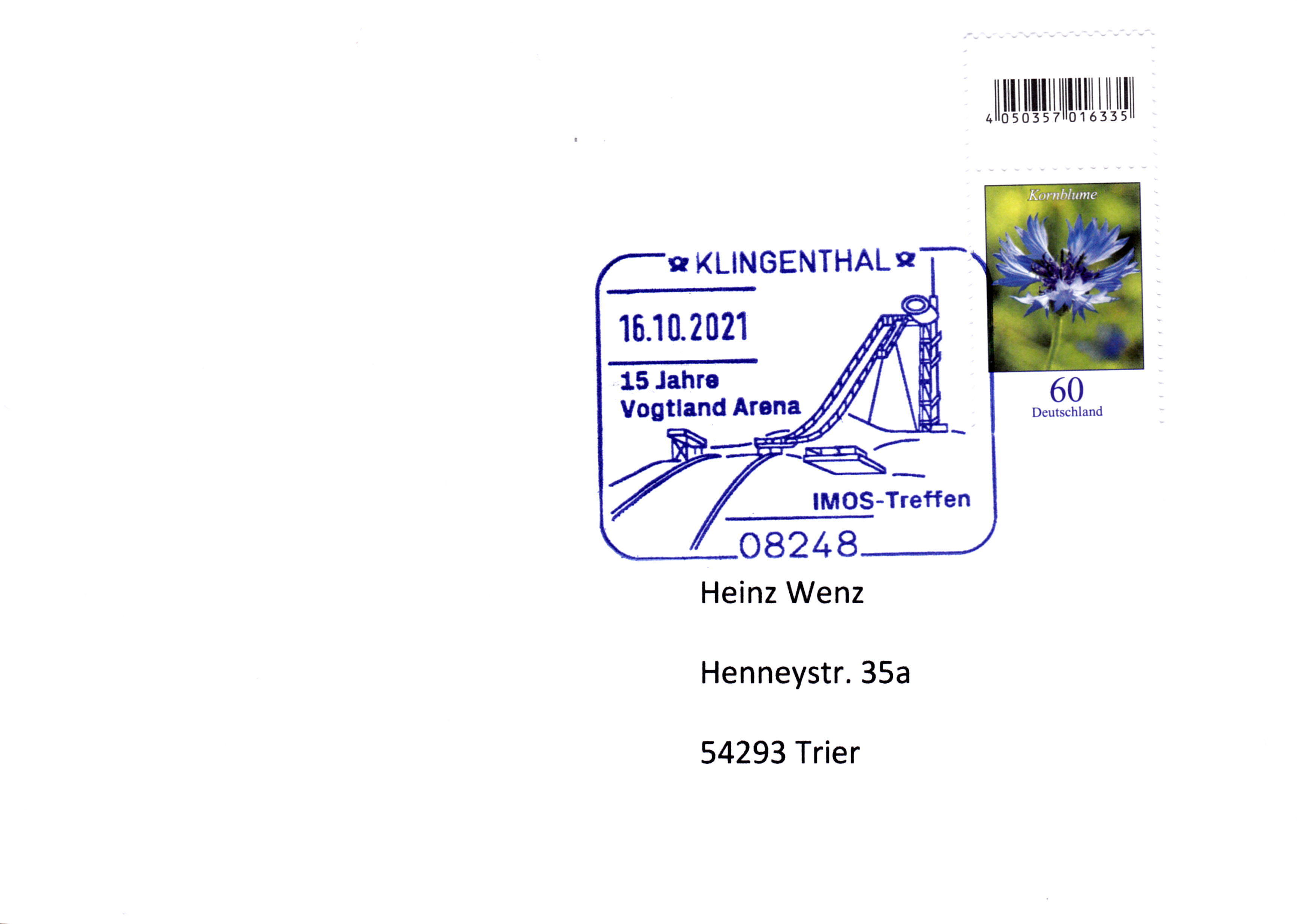 Dieser Sonderstempel aus Klingenthal vom 16.10.2021 zeigt im Stempelbild die Sprungschanze in Klingenthal.