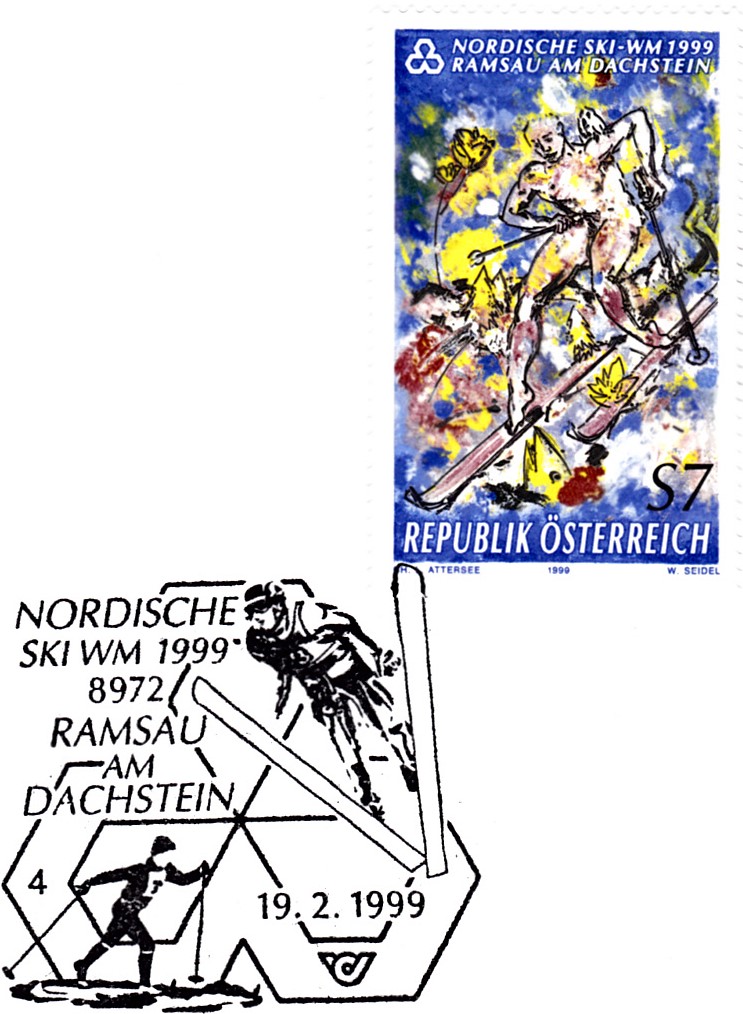 Im Sonderstempel mit der Kennziffer "4" aus Ramsau am Dachstein vom 19.2.1999 zur Nordischen Ski-Weltmeisterschaften 1999 in Ramsau wird unten auch ein Skispringer gezeigt.