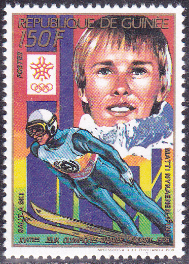 Matti Nykänen (geb. 17. Juli 1963 in Jyväskylä) ist ein ehemaliger finnischer Skispringer. In Guinea ist zu seinen Olympiasiegen 1988 diese Marke (MiNr 1223 A) erschienen.
