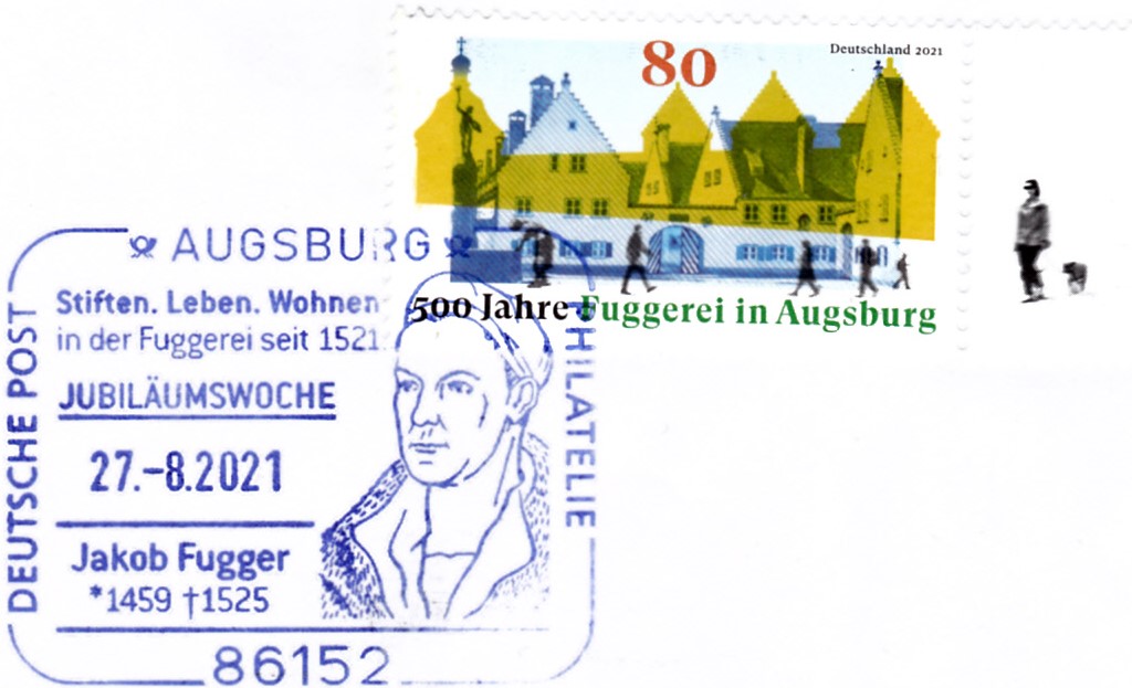 Zur Jubiläumswoche wurde in Augsburg am 27.8.2021 ein Sonderstempel mit einem Porträt von Jakob Fugger verwendet.