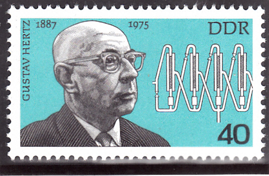 1987 erschien in der DDR zum 100. Geburtstag von Gustav Hertz eine weitere Marke (MiNr 3094) mit einem Porträt von Hertz. Auf der Marke werden auch ein Schaltbild und ein Diagramm zum sogenannten Franck-Hertz-Versuch gezeigt, der erstmals in den Jahren 1911 bis 1914 von James Franck und Gustav Hertz durchgeführt worden ist. Der Versuch belegt die Existenz von diskreten Energieniveaus in Atomen.