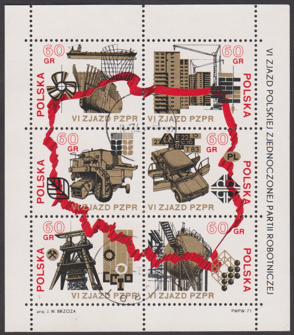 Am 06.12.1971 erschienen Polen MiNr. 2124 bis 2129 zusammenhängend gedruckt zum 6. Parteitag der Vereinigten Polnischen Arbeiterpartei (PZPR).