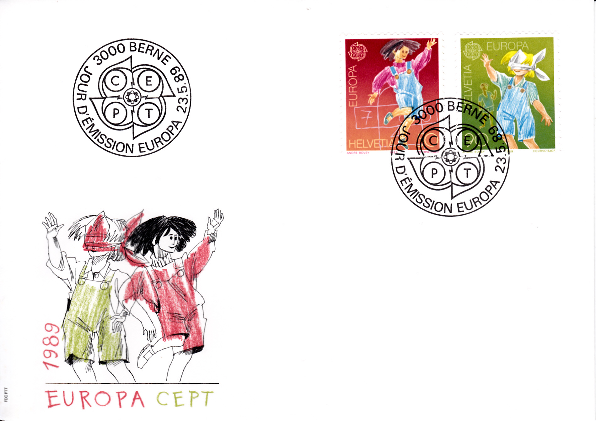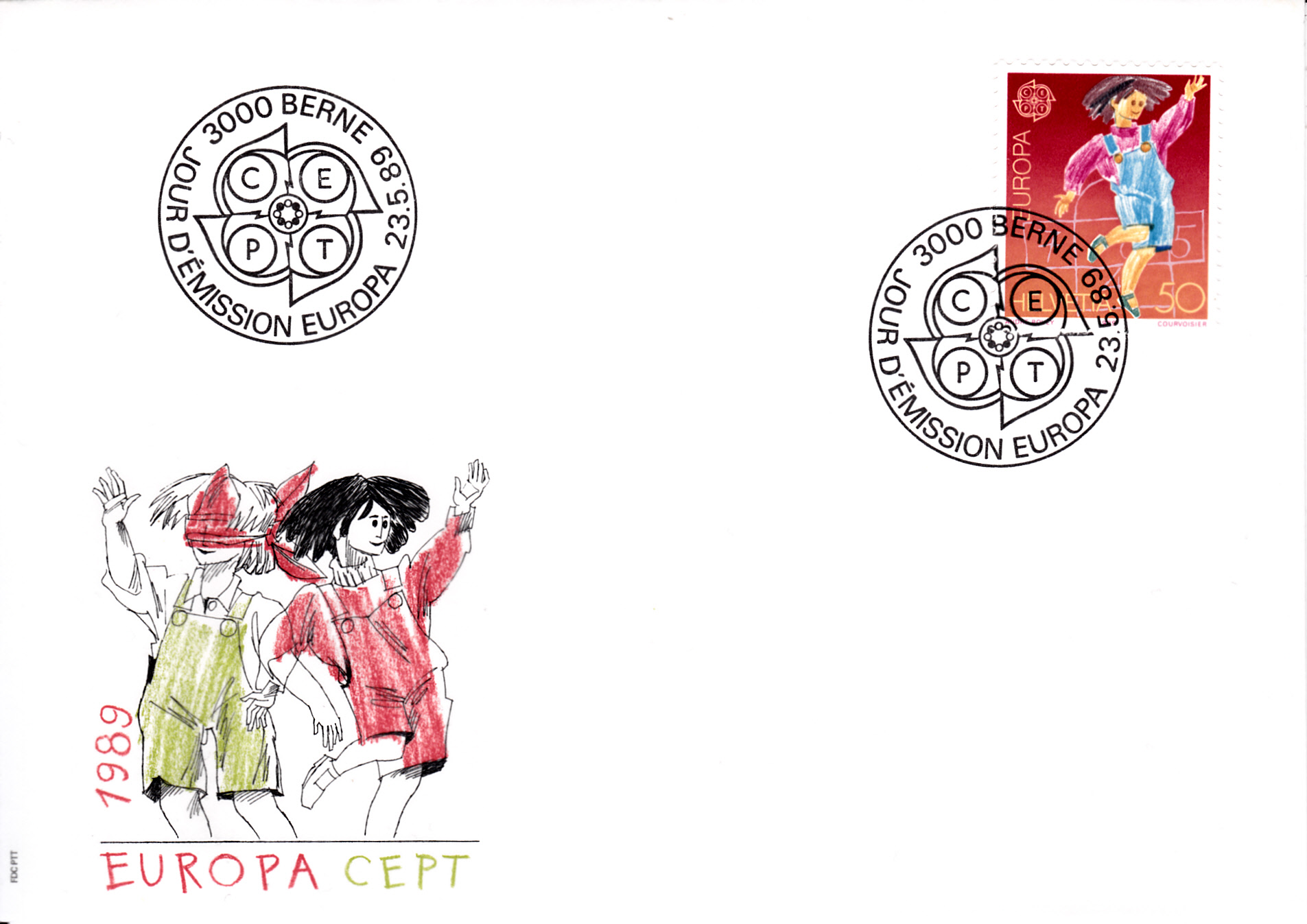 In der Schweiz erschienen die Europamarken 1989 zum Gemeinschaftsthema "Kinderspiele" am 23. Mai 1989. Hier die Marke zu 50 Rappen mit einem Kind bei einem Hüpfspiel. Die Auflage der Marke betrug 39 601 000 Stück.