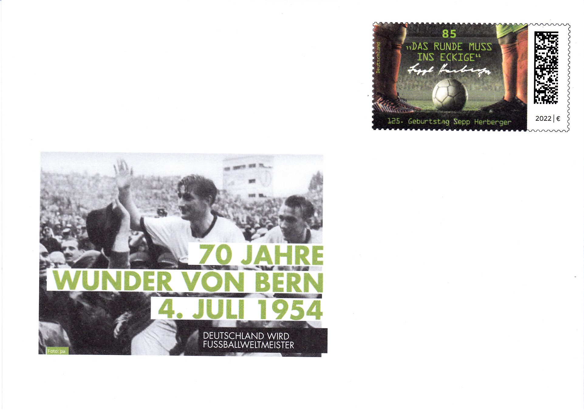 Umschlag zum Thema "70 Jahre Wunder von Bern" mit dem Wertstempel im Muster der Marke zum 125. Geburtstag von Josef Herberger (MiNr 3675).