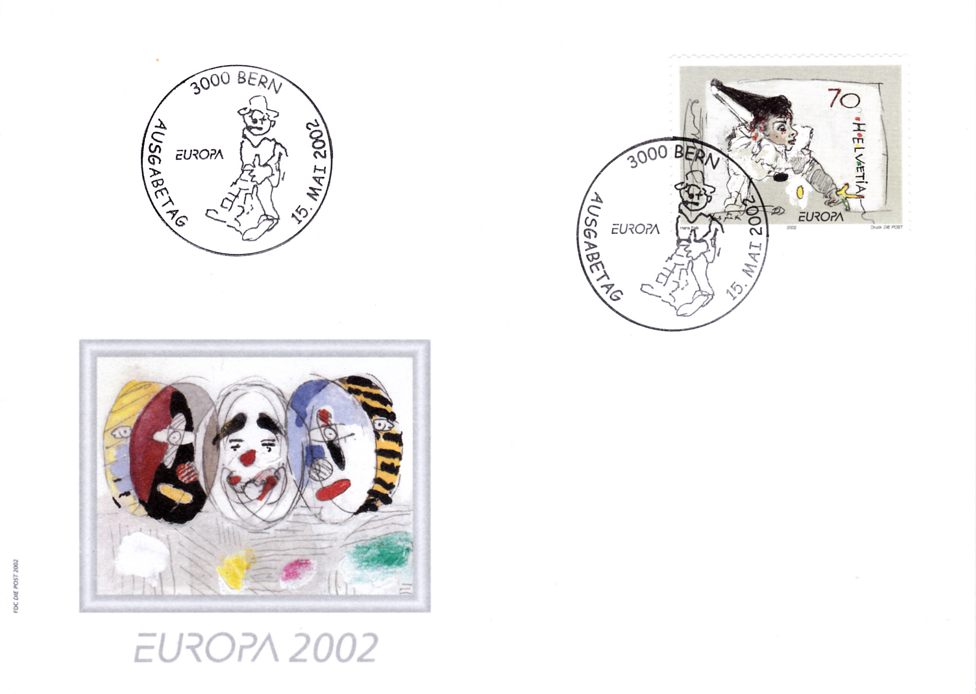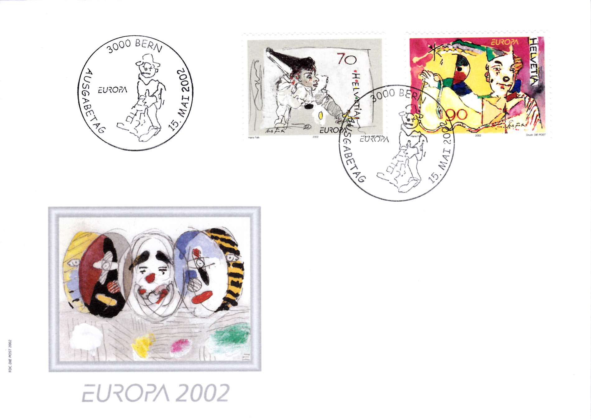 Die Europamarken 2002 zum Thema "Zirkus" erschienen in der Schweiz am 15. Mai 2002. Hier zeige ich die Marke zu 70 Rappen mit der Abbildung eines Clowns nach einem Gemälde von Hans Falk (1918-2002, Zeichner und Maler) als Viererblock auf einem FDC. Die Auflage dieser Marke beträgt 6 700 000 Stück.