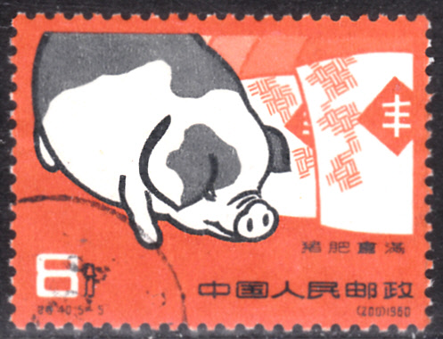 In der Volksrepublik China ist 1960 eine Serie "Entwicklung der Schweinezucht" erschienen. Die erste Marke der Serie (MiNr 546) zeig ein Schwein mit Ferkeln.