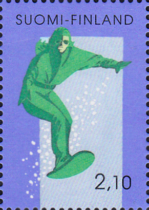 In Finnland erschien diese Marke (MiNr 1153) mit der Abbildung eines Snowboardfahrers mit weiteren Marken in einer Blockausgabe unter dem Thema "Jugendhobbys - Alpinskifahren".
