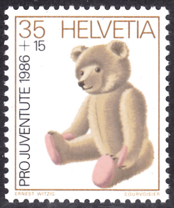 Aus der Serie "Pro Juventute" 1986 stammt diese Marke (MiNr 1331) mit einem Teddybär, die ich hier postfrisch zeige. Als Briefausschnitt mit einem thematisch zur Marke passenden Maschinenwerbestempel wurde sie bereits früher hier gezeigt.