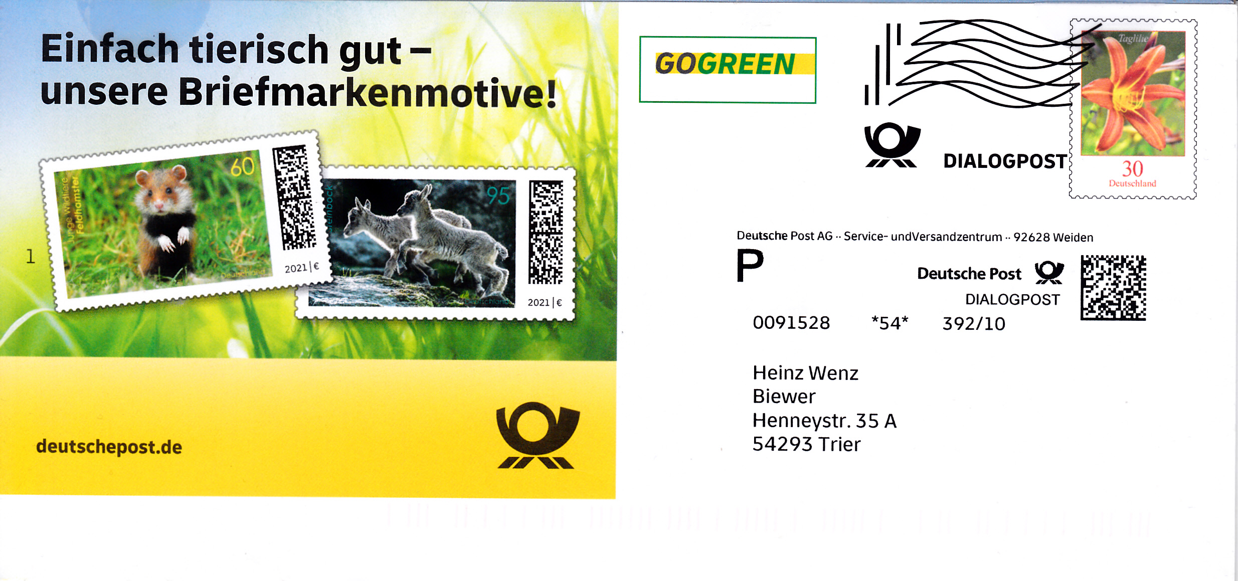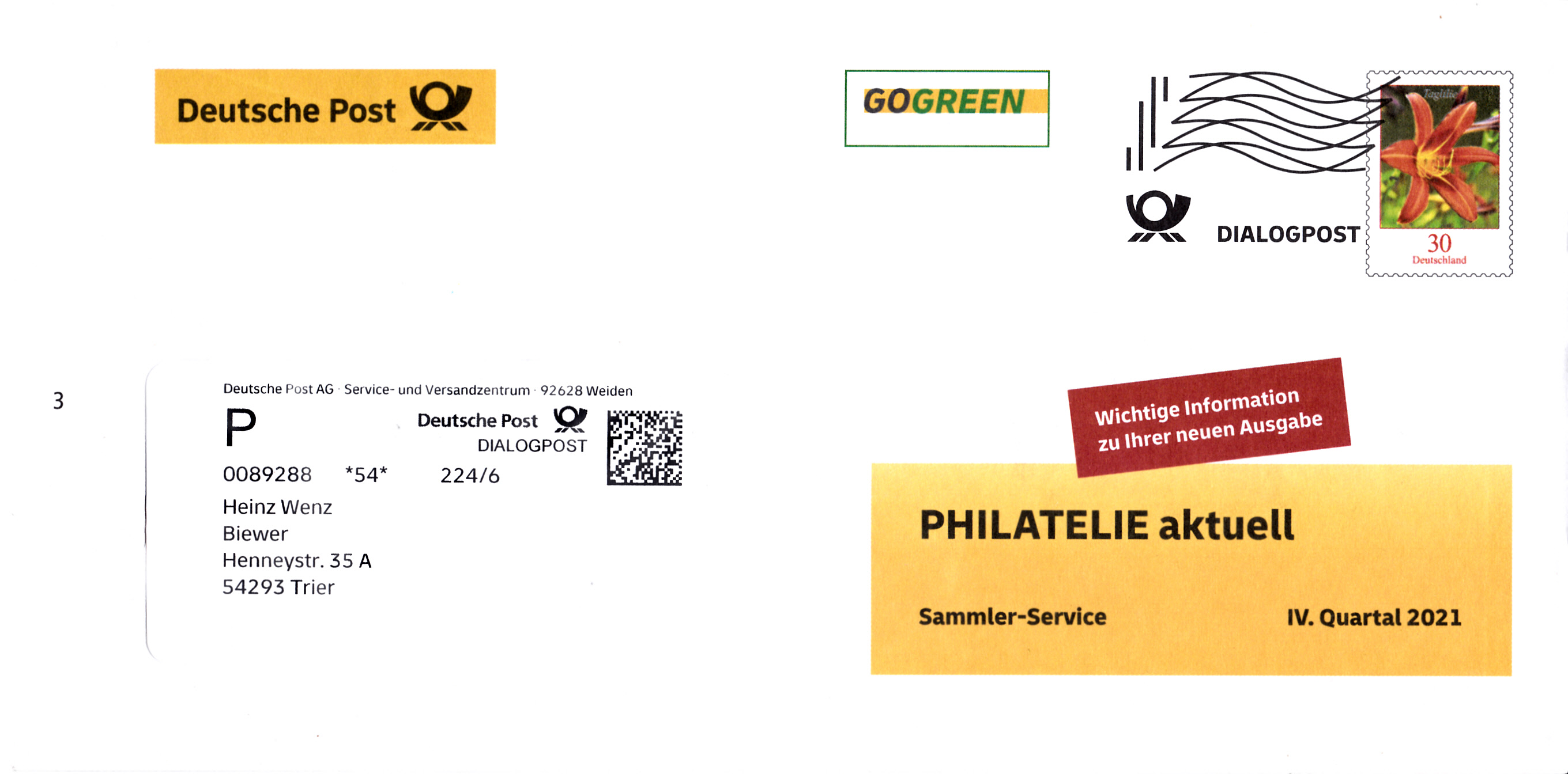 Faltbrief 210 mm x 102 mm mit Wertstempel der 30 Cent-Marke der Dauerserie "Blumen" (MiNr 3509) "Taglilie" mit aufgedruckter Zähnung. Der Wertstempel ist mit einer Welle "Dialogpost" entwertet.