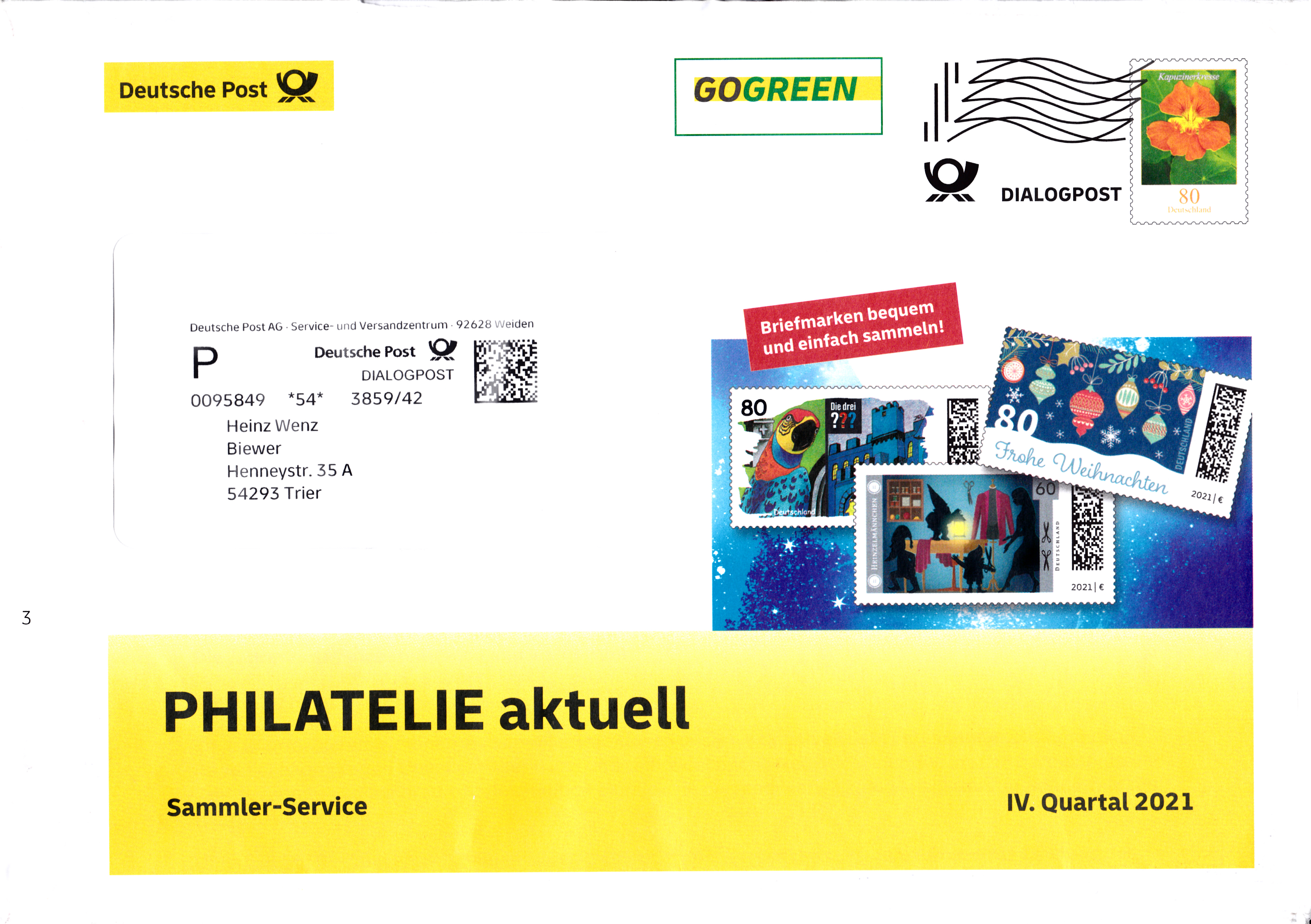 Umschlag im Format 229x162 mm mit einem Wertstempel mit der 80 Cent Marke (MiNr 3469) aus der Dauerserie "Blumen" mit dem Motiv "Große Kapuzinerkresse (Tropaeolum majus)" mit aufgedruckter Zähnung. Der Wertstempel ist mit einer Welle "Dialogpost" entwertet.