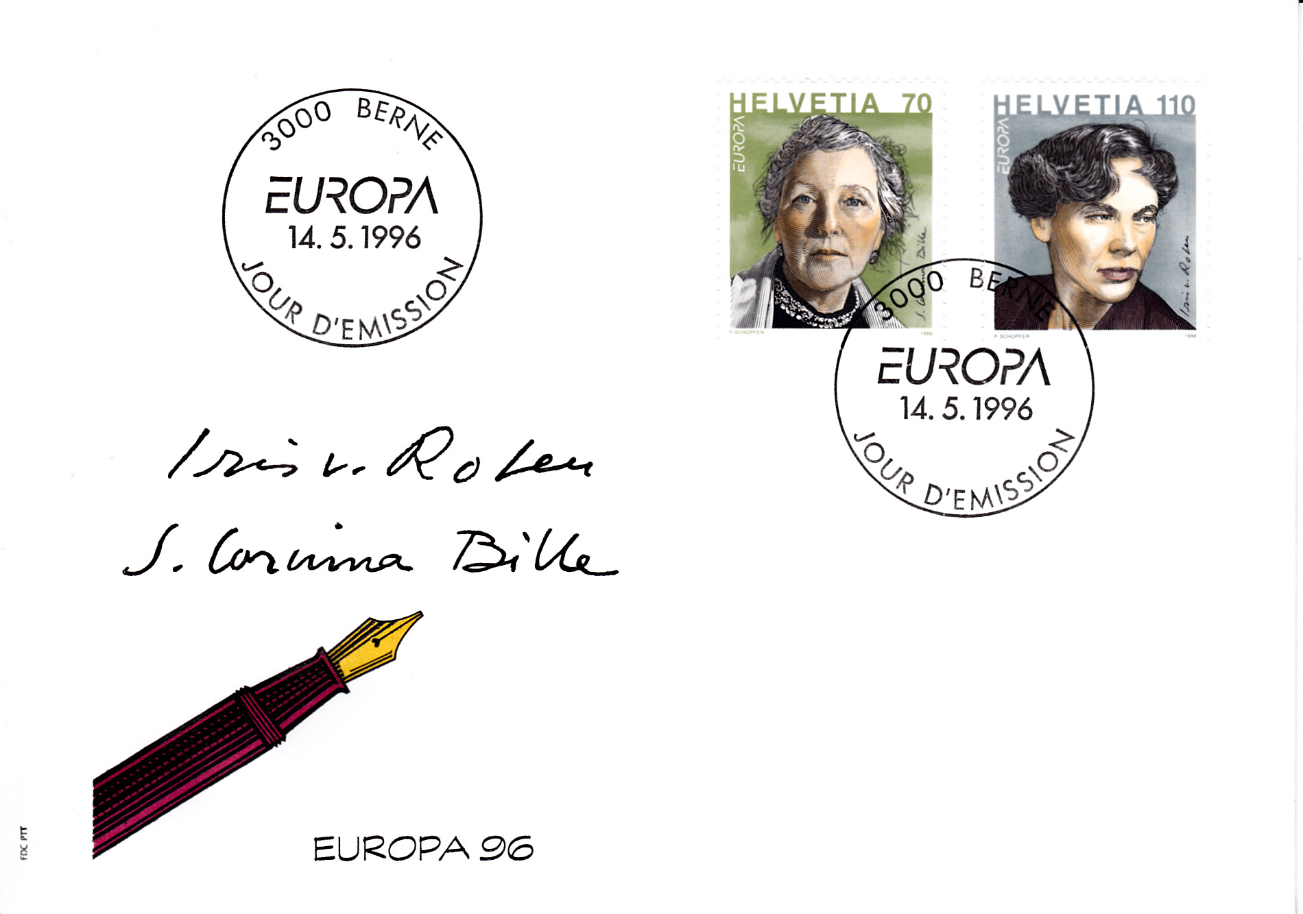 In der Schweiz erschienen die Europamarken 1996 am 14. Mai 1996 zum Gemeinschaftsthema "Berühmte Frauen". Hier eine Marke zu 70 Rappen mit einem Porträt von Corinna Bille (1912–1979), Schriftstellerin. Die Auflage betrug 22 562 000 Stück.