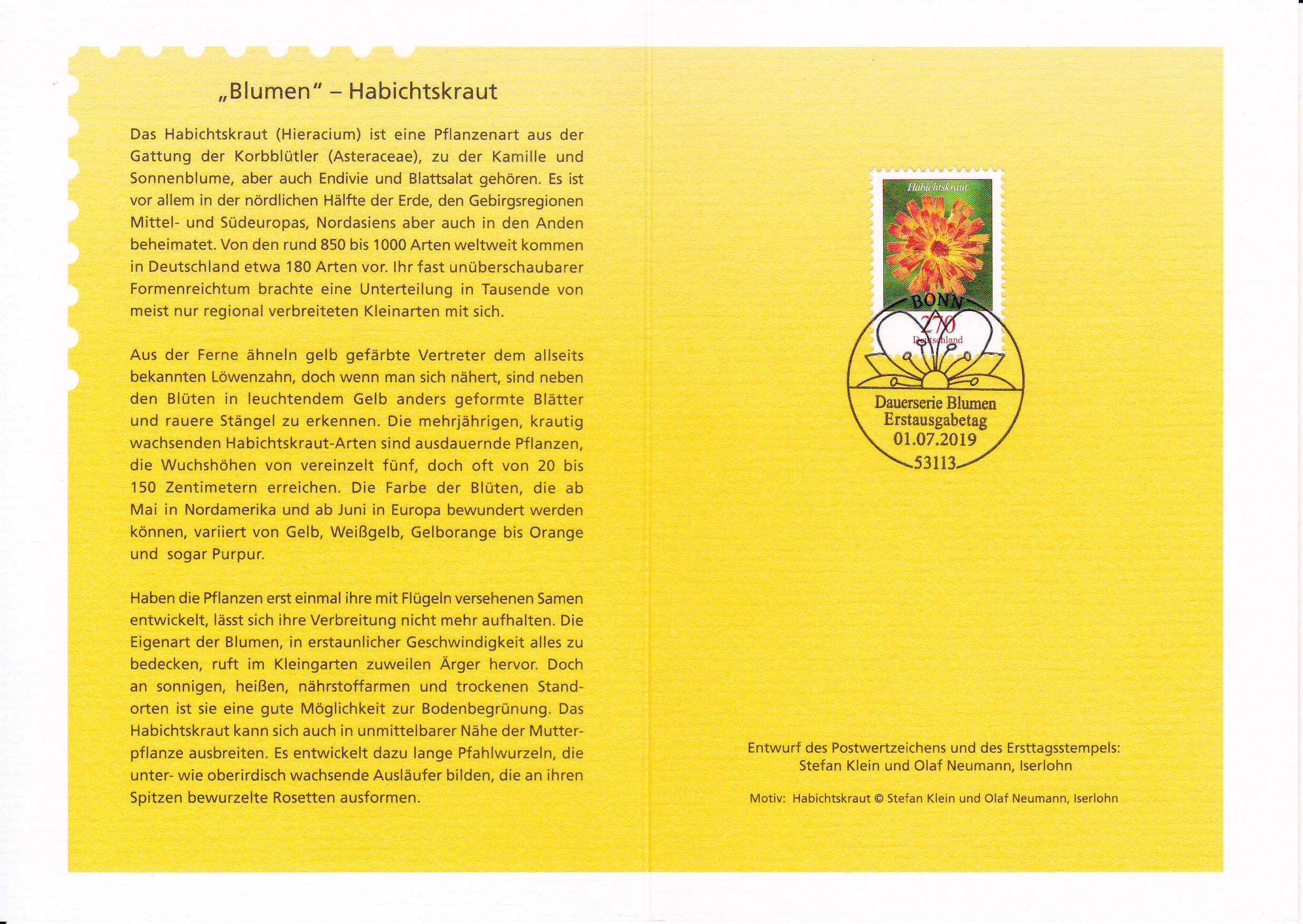 Die Marke zu 270 Cent mit dem Habichtskraut gibt es seit 1.8.2019 auch als selbstklebende Marke (MiNr 3490) aus einem Markenset oder Folienblatt (MiNr Folienblatt 93).