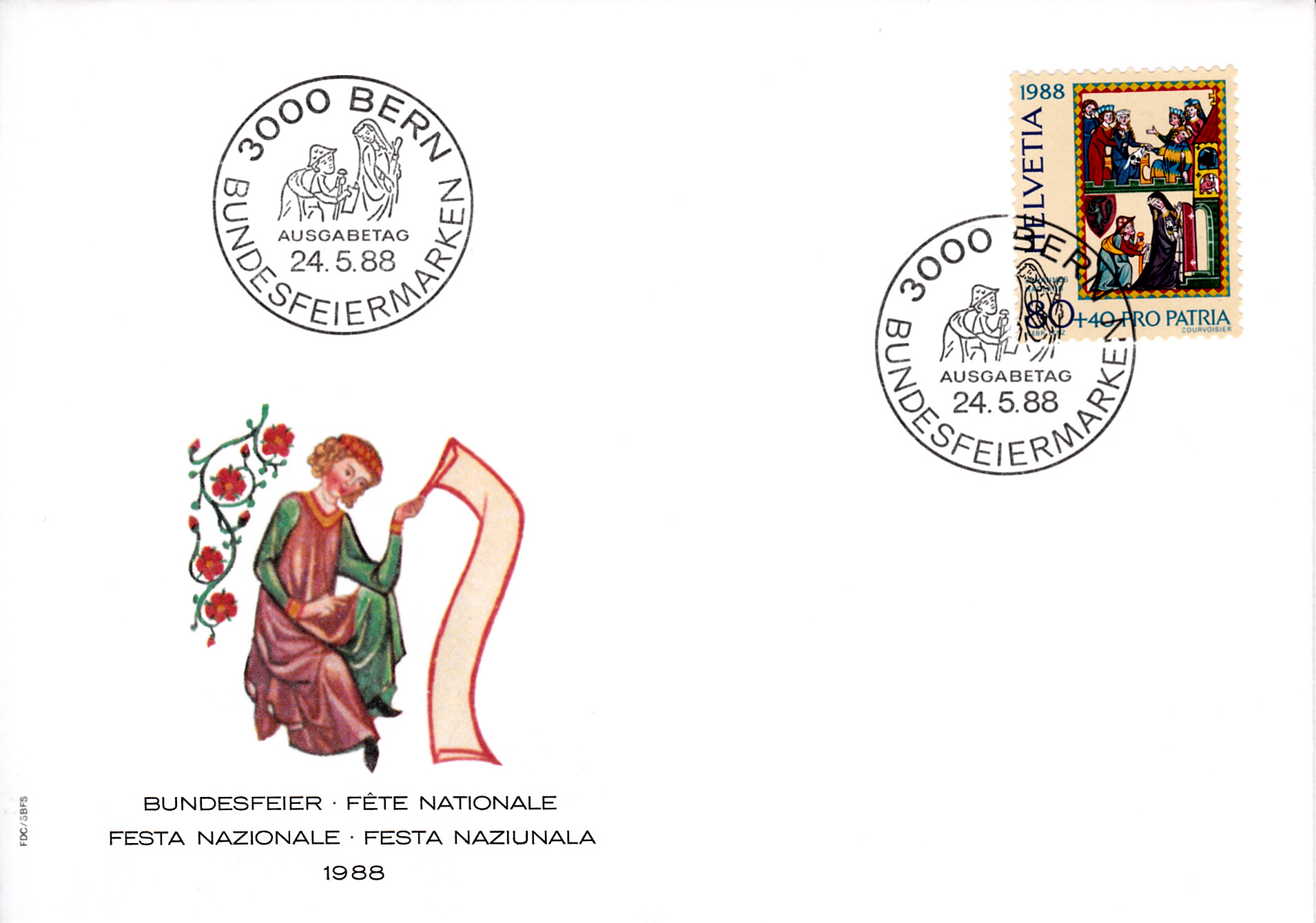 Auf diesem FDC sind alle vier Werte der Serie "Pro Patria" 1988 verklebt worden.