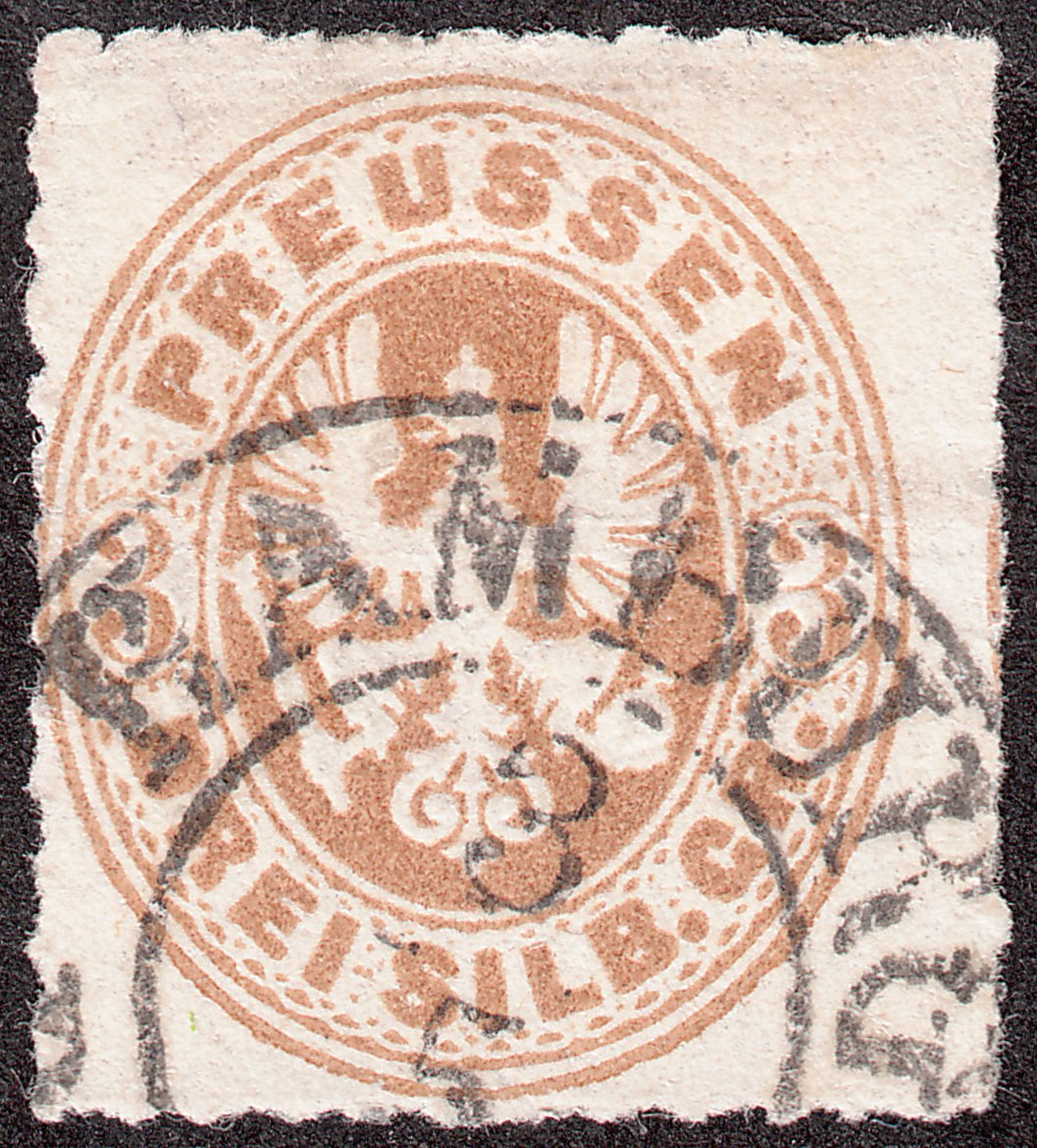 Deutlich nach links dezentrierte Exemplar der MiNr. 18 mit Zweikreisstempel "HAMBURG B(AHNHOF 3 5" vom Preußischen Postamt in Hamburg: