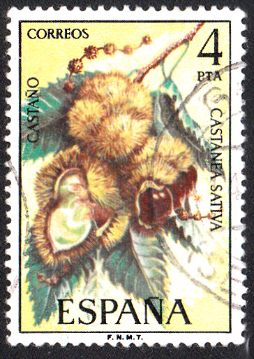 Auf dieser Marke aus Spanien (MiNr 2149) sehen wir Esskastanien an einem Zweig.