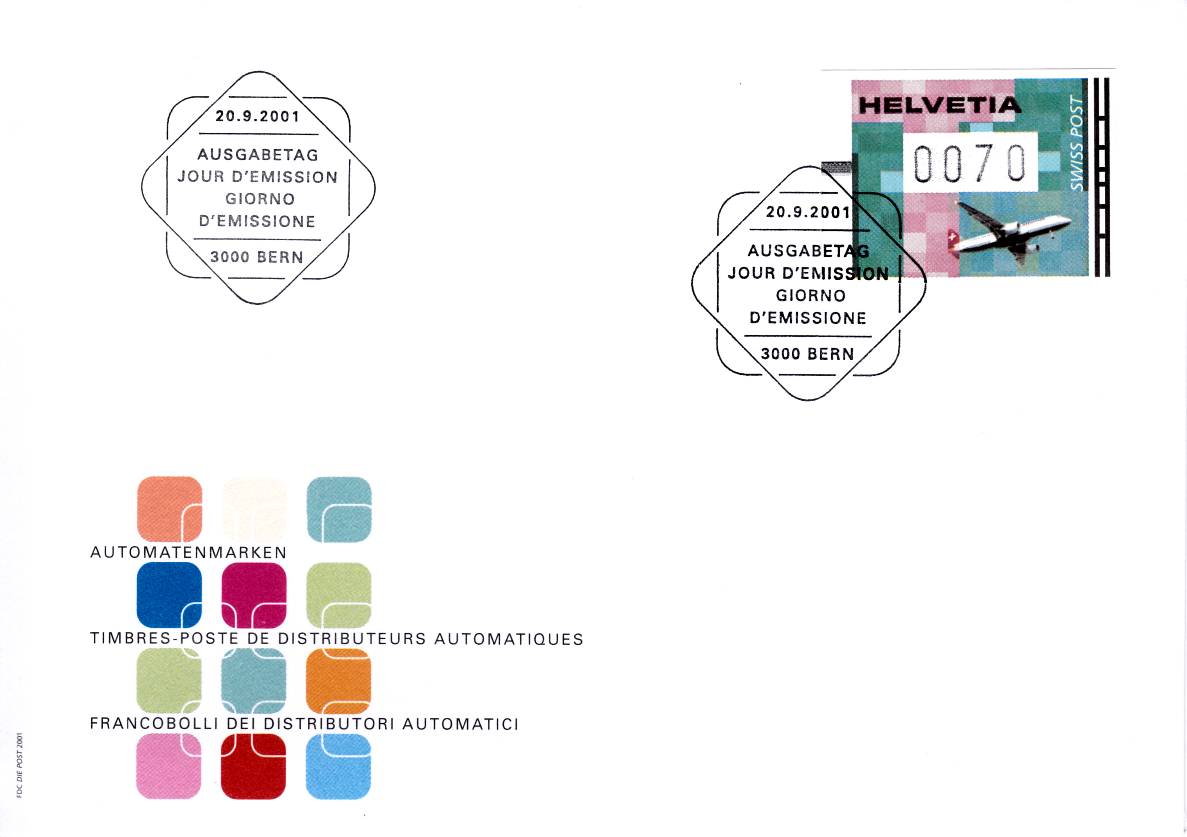 FDC der Schweizer Post mit der bereits gezeigten Automatenmarken aus der Serie "Transportmittel der Post" mit dem Motiv "Flugzeug" (MiNr 14).