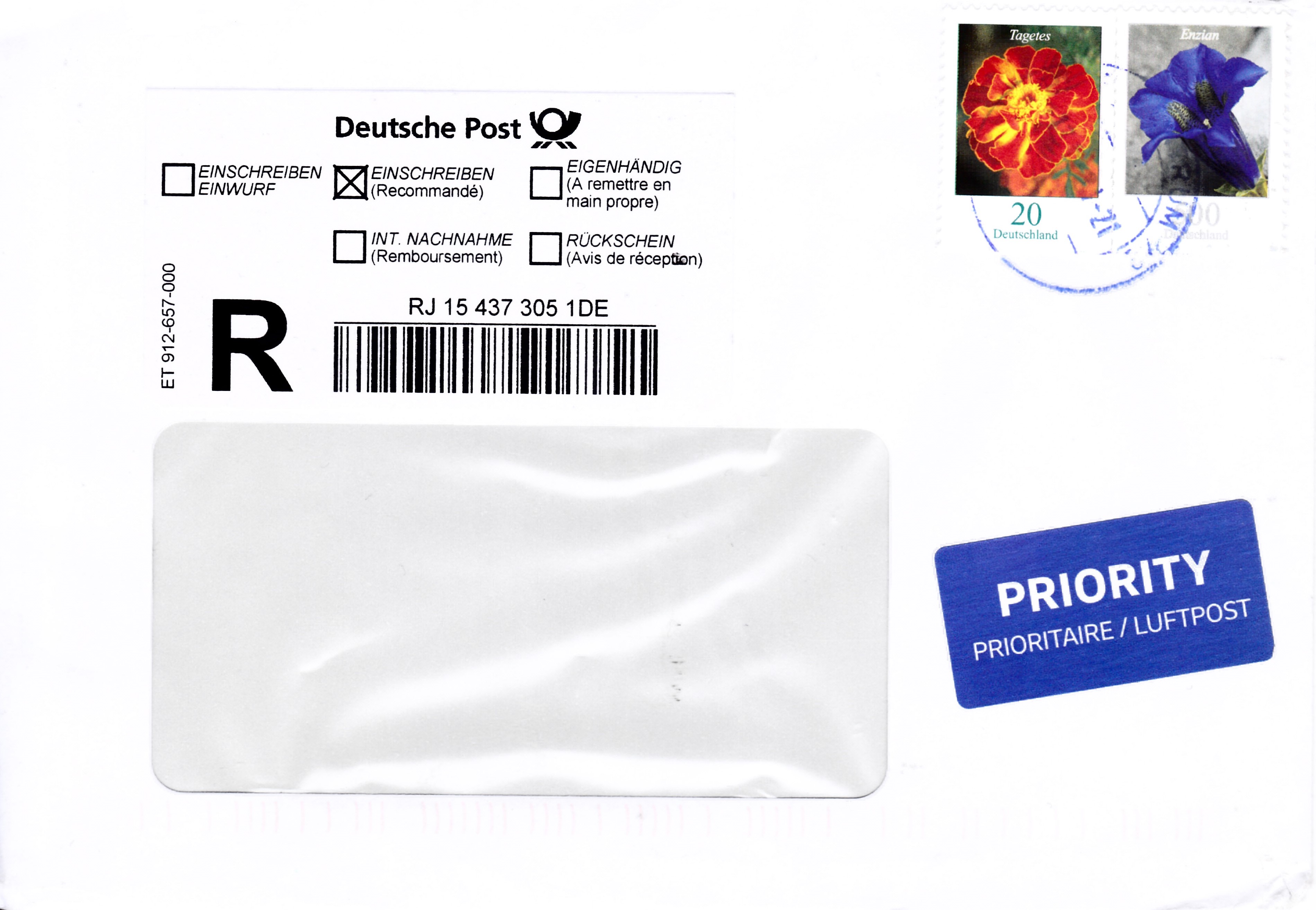 Dieser Brief bis 50 ins Ausland wurde als Einschreiben verschickt. Das Porto berechnet sich wie folgt: Kompaktbrief bis 50g 170 Cent, Sonderleistung Einschreiben Ausland 350 Cent ergibt zusammen 520 Cent. Das Porto wurde mit je einer Marke aus der DS "Blumen" zu 500 Cent und 20 Cent beglichen.
