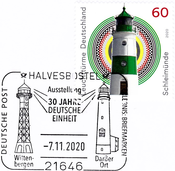 Der hier schon beschriebene Leuchtturm Darßer Ort ist auf diesem Sonderstempel vom 7.11.2020 aus Halvesbostel auf der rechten Stempelseite abgebbildet.