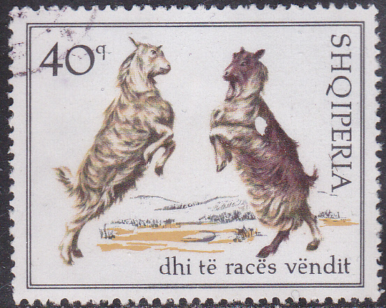 Zwei Ziegenböcke kämpfen hier auf dieser Marke aus der gleichen Serie aus Albanien (MiNr 1260) miteinander.