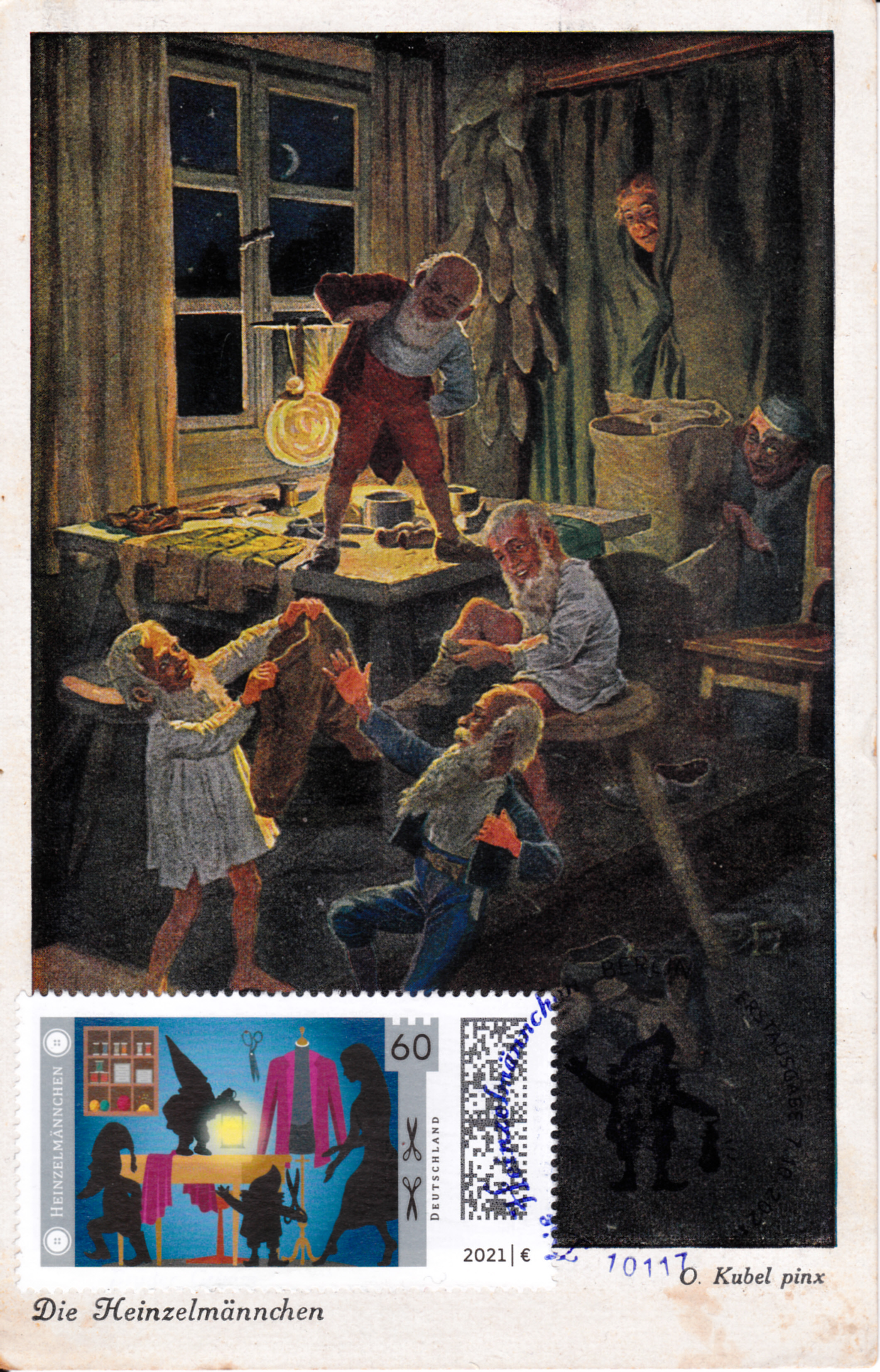 Maximumkarte mit der Marke mit den "Heinzelmännchen" und dem vom Motiv passenden Ersttagsonderstempel aus Berlin (der leider auf dem dunklen Hintergrund kaum zu erkennen ist).