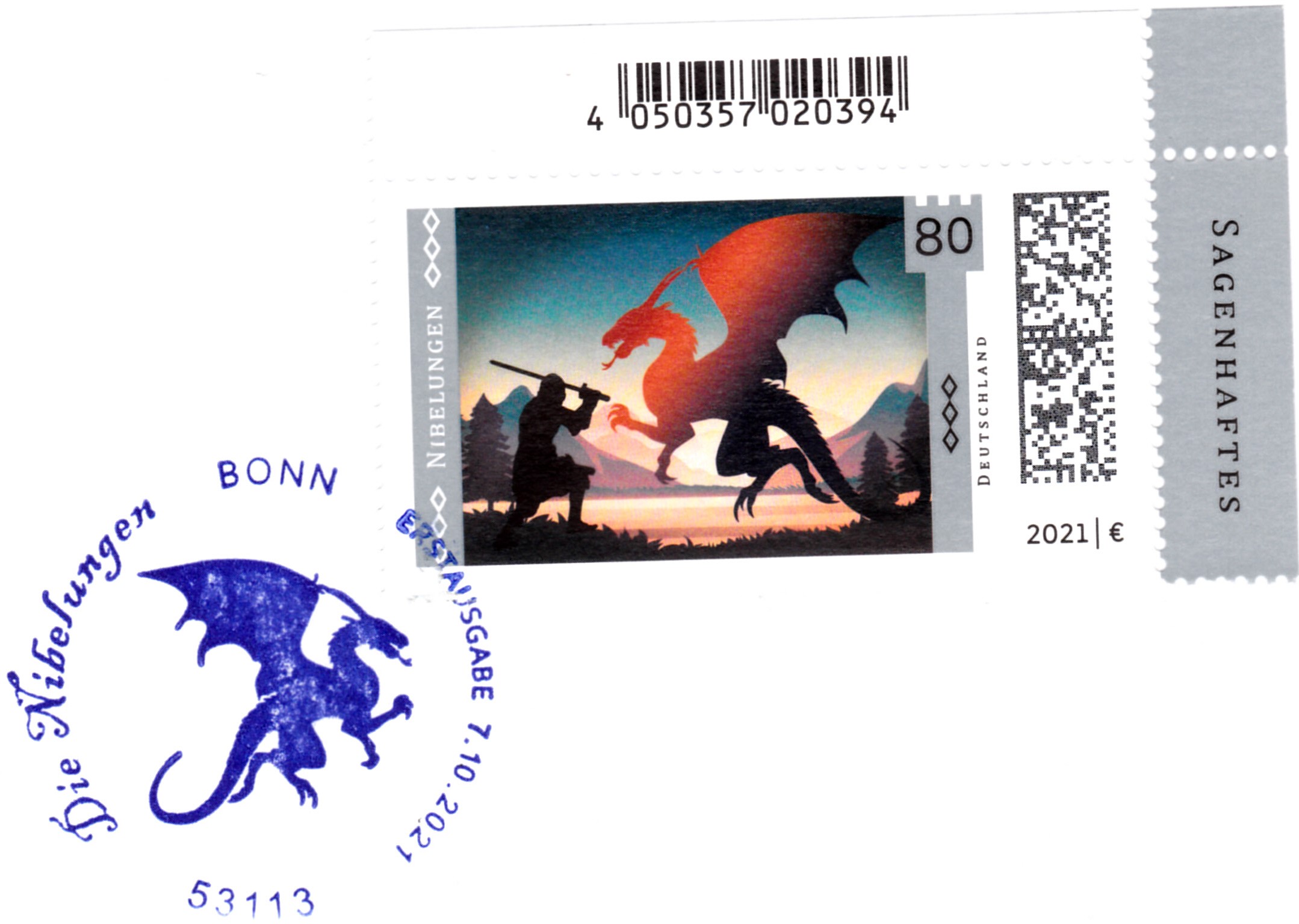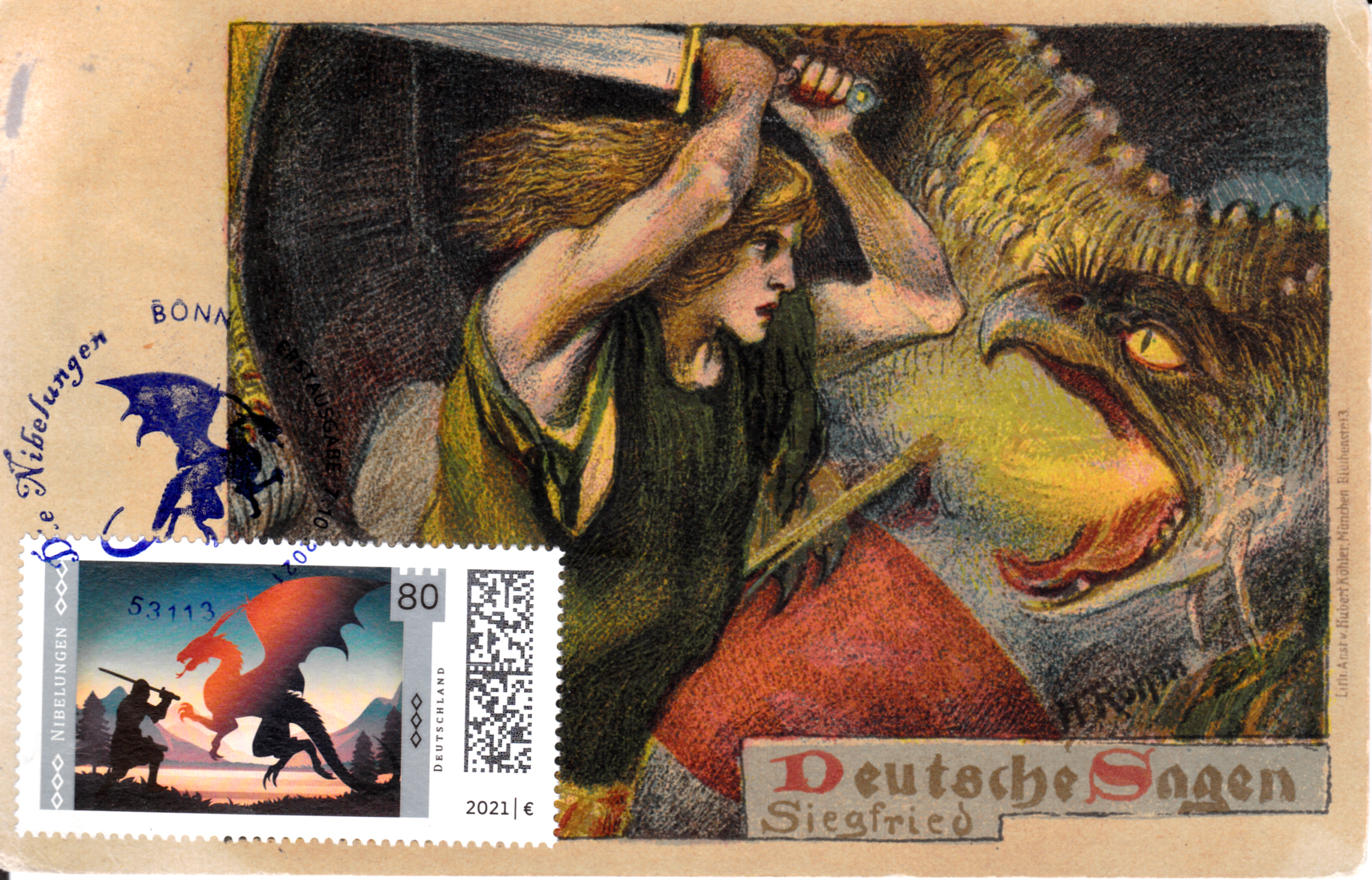 In der Serie "Sagenhaftes Deutschland" ist diese Marke (MiNr 3632) mit der Darstellung "Siegfried erschlägt Fáfnir" (den Drachen).