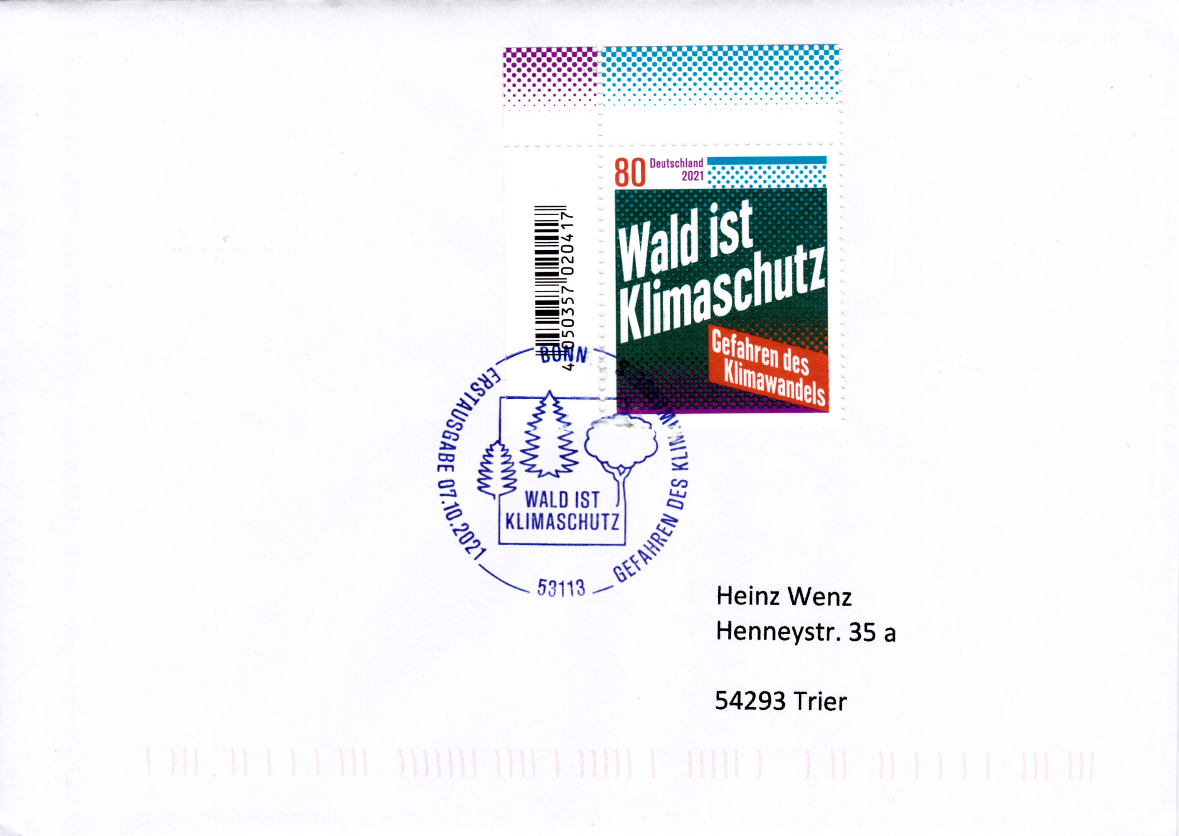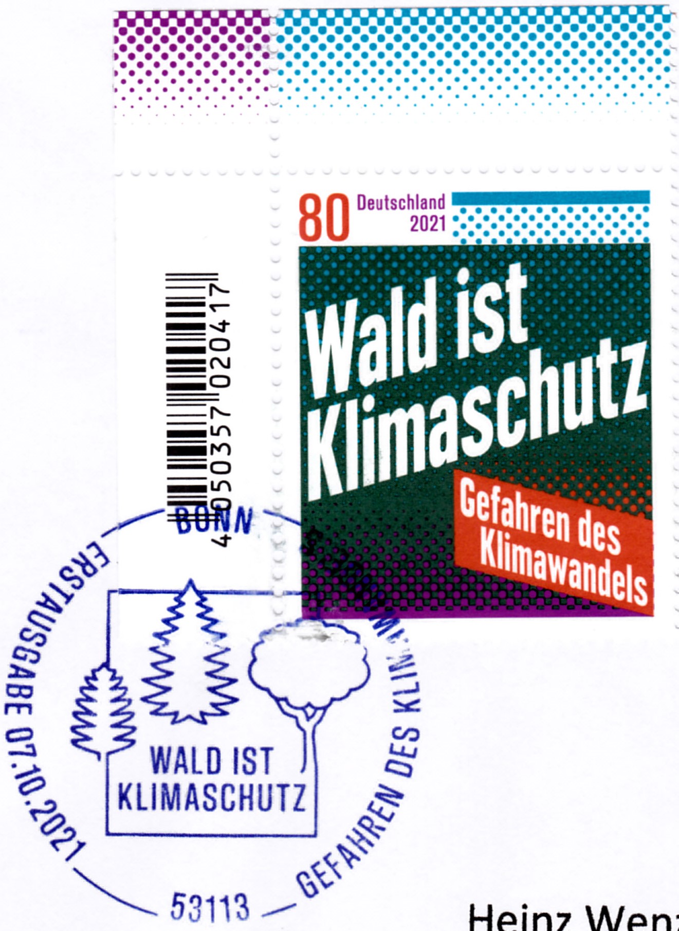 Bei der Deutschen Post ist diese Marke (MiNr 3634) zum Thema "Gefahren des Klimawandels" erschienen. Sie weist mit den Schlagzeilen "Wald ist Klimaschutz" und "Gefahren des Klimawandels" auf die Probleme des Klimawandels hin.