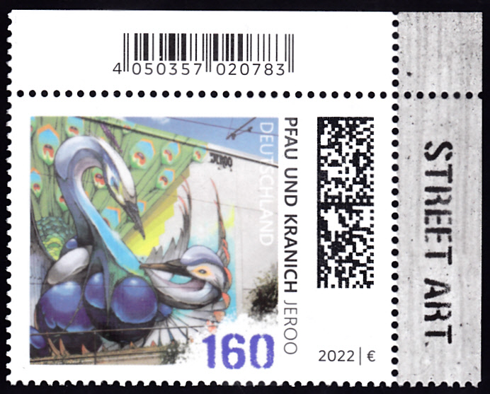 Auf einer Sonderbriefmarke der Serie "Street Art" der Deutschen Post (MiNr 3667) ist eines seiner "Murals" (Wandbilder) "Pfau und Kranich" zu sehen. Hier zeigen ich ein Eckrandstück mit EAN-Codierung.