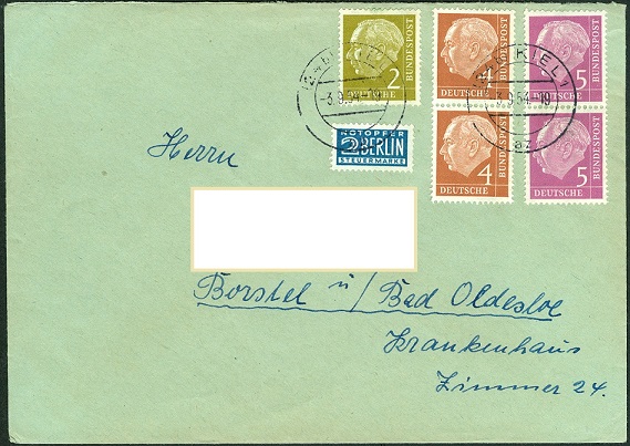 Auch dieser zweite Brief aus dem September 1954 ging ins Krankenhaus. Genauso liebevoll mit einer Heuss-Mischfrankatur beklebt wie der vorherige.