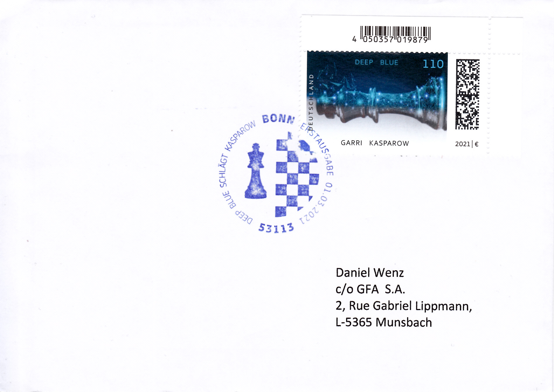Klappkarte des Vorstandsvorsitzenden der Deutschen Post AG mit der Marke "Schachcomputer Deep Blue schlägt Weltmeister Garri Kasparow" (MiNr 2895) und dem Ersttagsonderstempel Bonn.