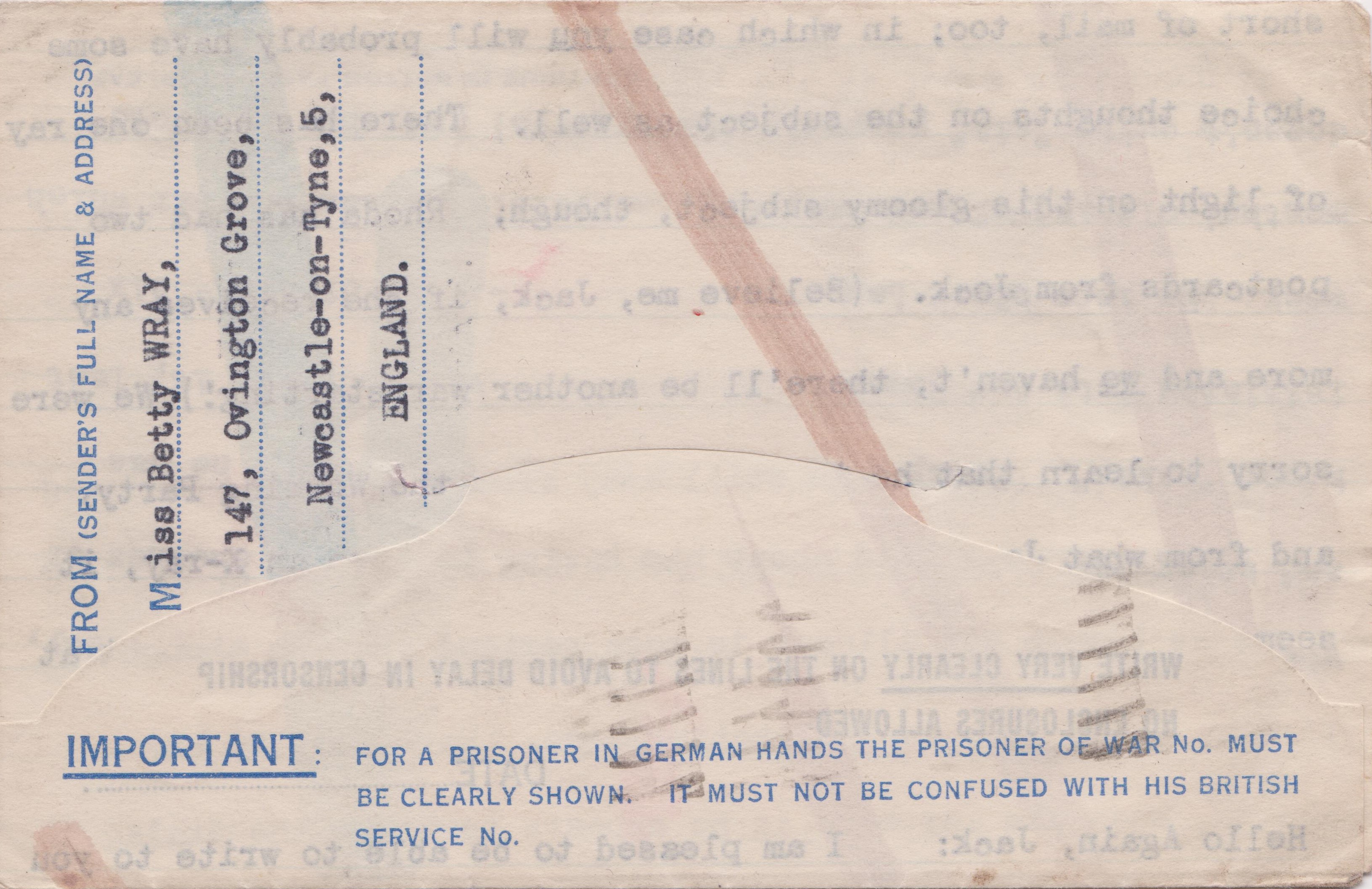 Britischer Ganzsachenvordruck "PRISONER OF WAR POST / KRIEGSGEFFANGENENPOST", verwendet am 05.08.1944 ab "NEWCASTLE-ON-TYNE", adressiert an "Dvr. (=Driver) A.J.S. (=Adam John Stanley) Gregson, PRISONER Of WAT No. 5166, Camp STALAG XVIIIA, Germany":