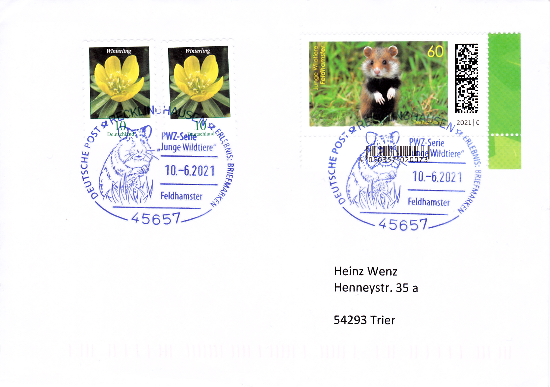 Klappkarte des Vorstandsvorsitzenden der Deutschen Post AG mit je einer Marke der Serie "Tierbabys" (MiNr 3608/3609) mit den Motiven "Feldhamster (Cricetus cricetus)" und "Alpensteinbock (Capra ibex)" und dem Ersttagsonderstempel Bonn.