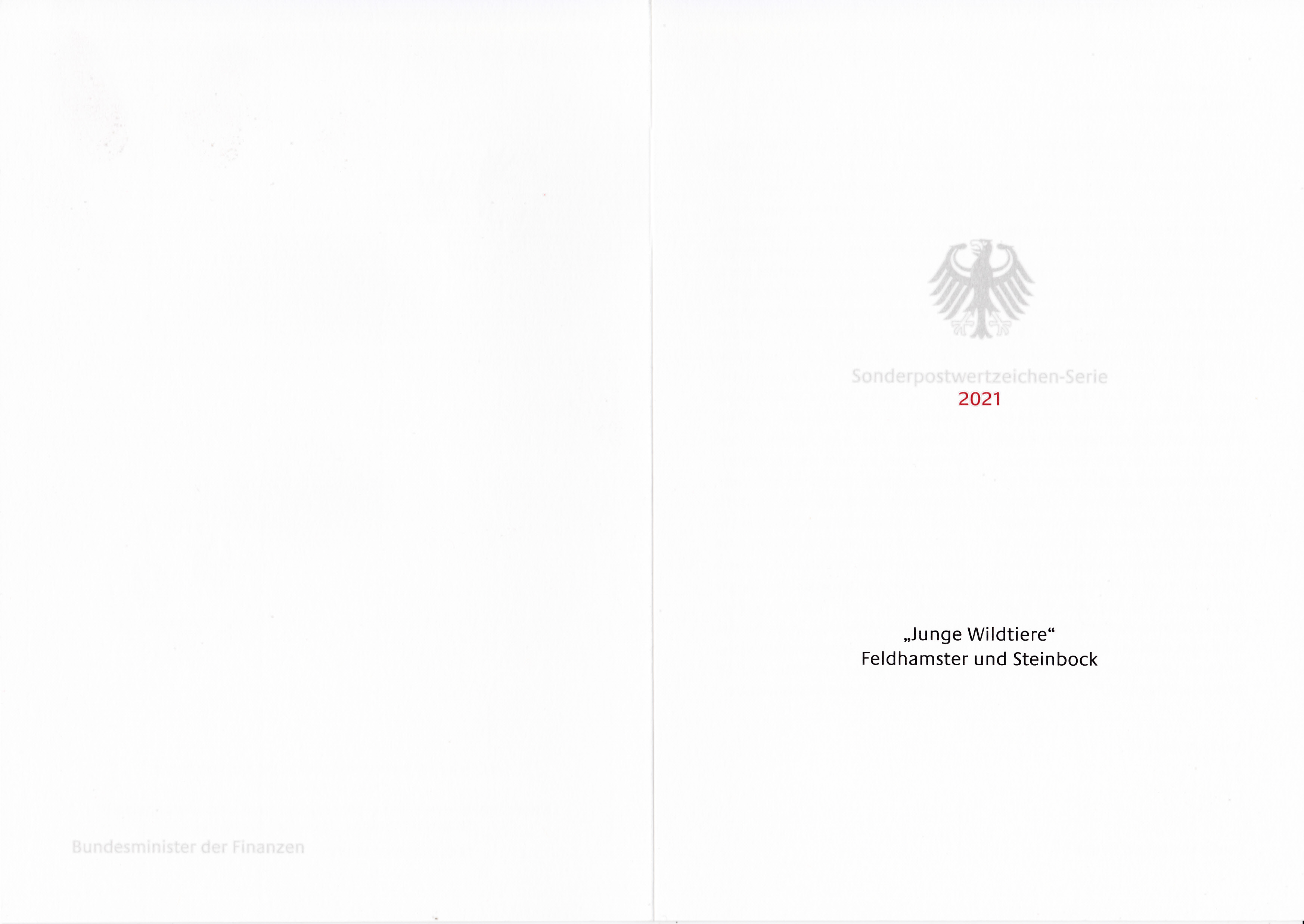 Ministerkarte des Finanzministers mit je einer Marke der Serie "Tierbabys" (MiNr 3608/3609) mit Motiven "Feldhamster (Cricetus cricetus)" und "Alpensteinbock (Capra ibex)". Die Marken sind mit den jeweils passenden Ersttagsonderstempel Berlin und dem Ersttagsonderstempel Bonn gestempelt.