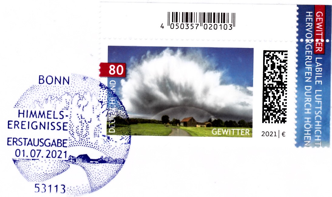 Diese Ganzsache zum 200. Geburtstag von Hermann von Helmholtz hat einen Wertstempel mit der Marke "Kelvin-Helmholtz-Wolken" (MiNr 3527) aus der Serie "Himmelsereignisse".