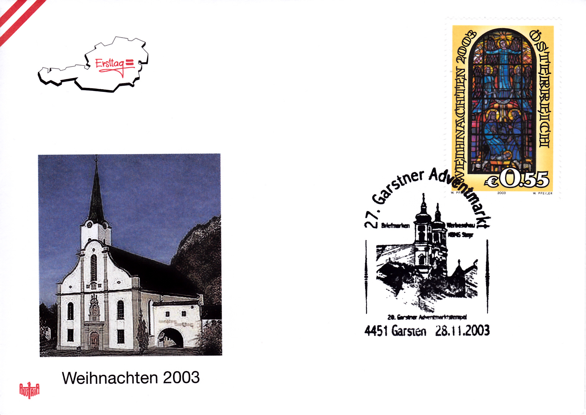 Auf dieser Marke aus Österreich (MiNr 2453) sehen wir sein Werk "Christi Geburt" ein Glasfenster in der Pfarrkirche Hohenems.