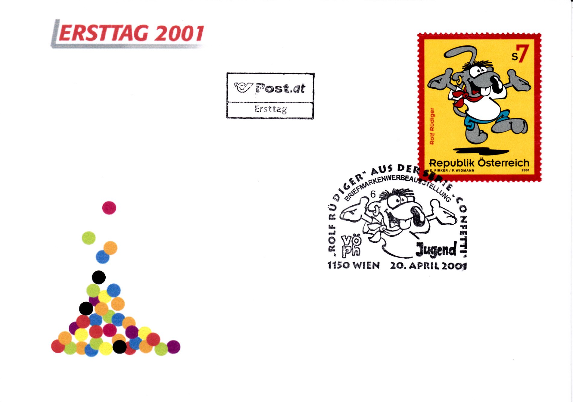 Auf dieser Marke aus Österreich (MinNr 2341) aus der Reihe "Figuren aus dem Kinderfernsehprogramm 'Confetti TiVi'" sehen wir "Rolf Rüdiger", eine prominente Fernseh- und Radioratte, die von 1994 bis 2008 im ORF-Kinderprogramm "Confetti TiVi" zu sehen war.