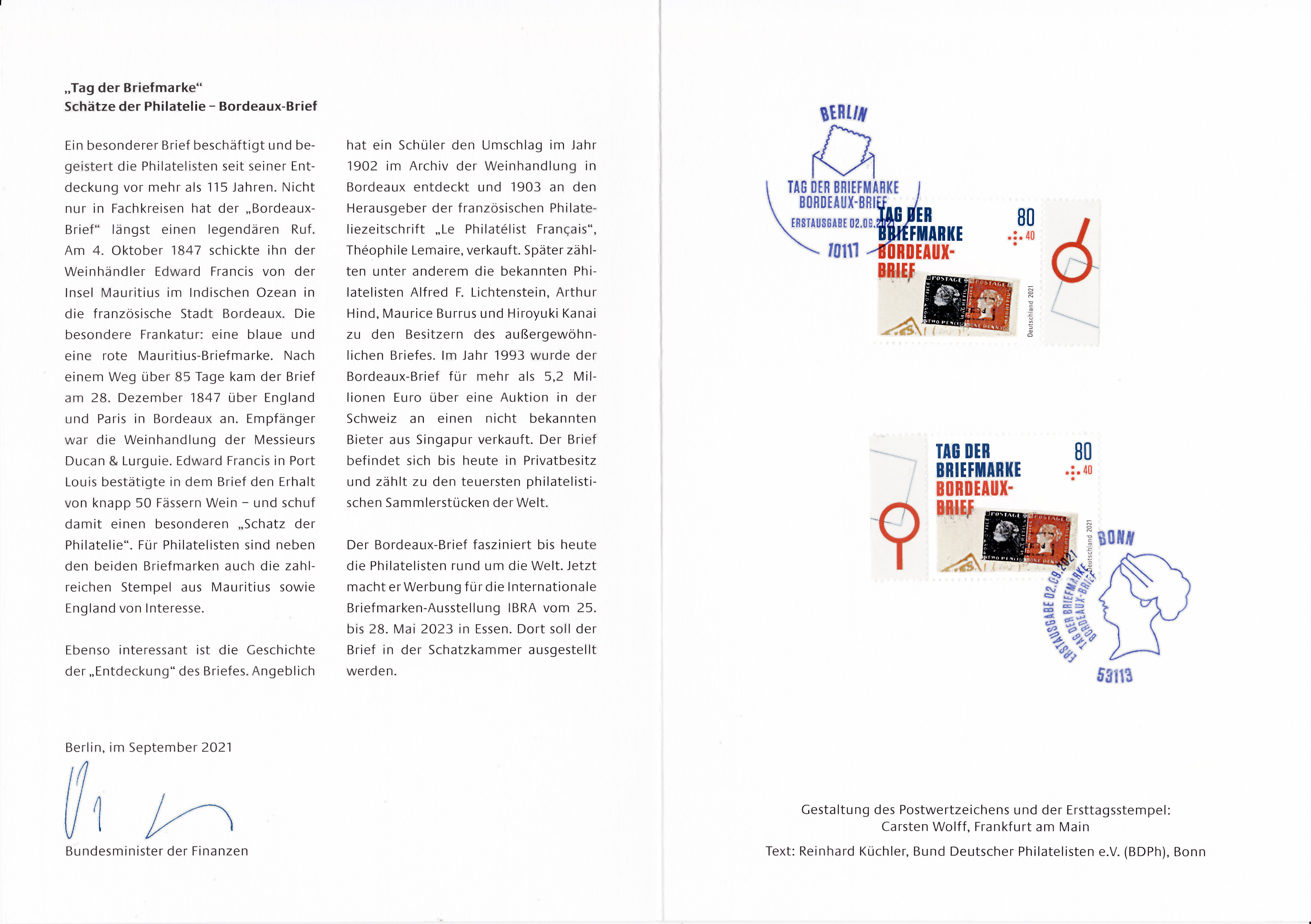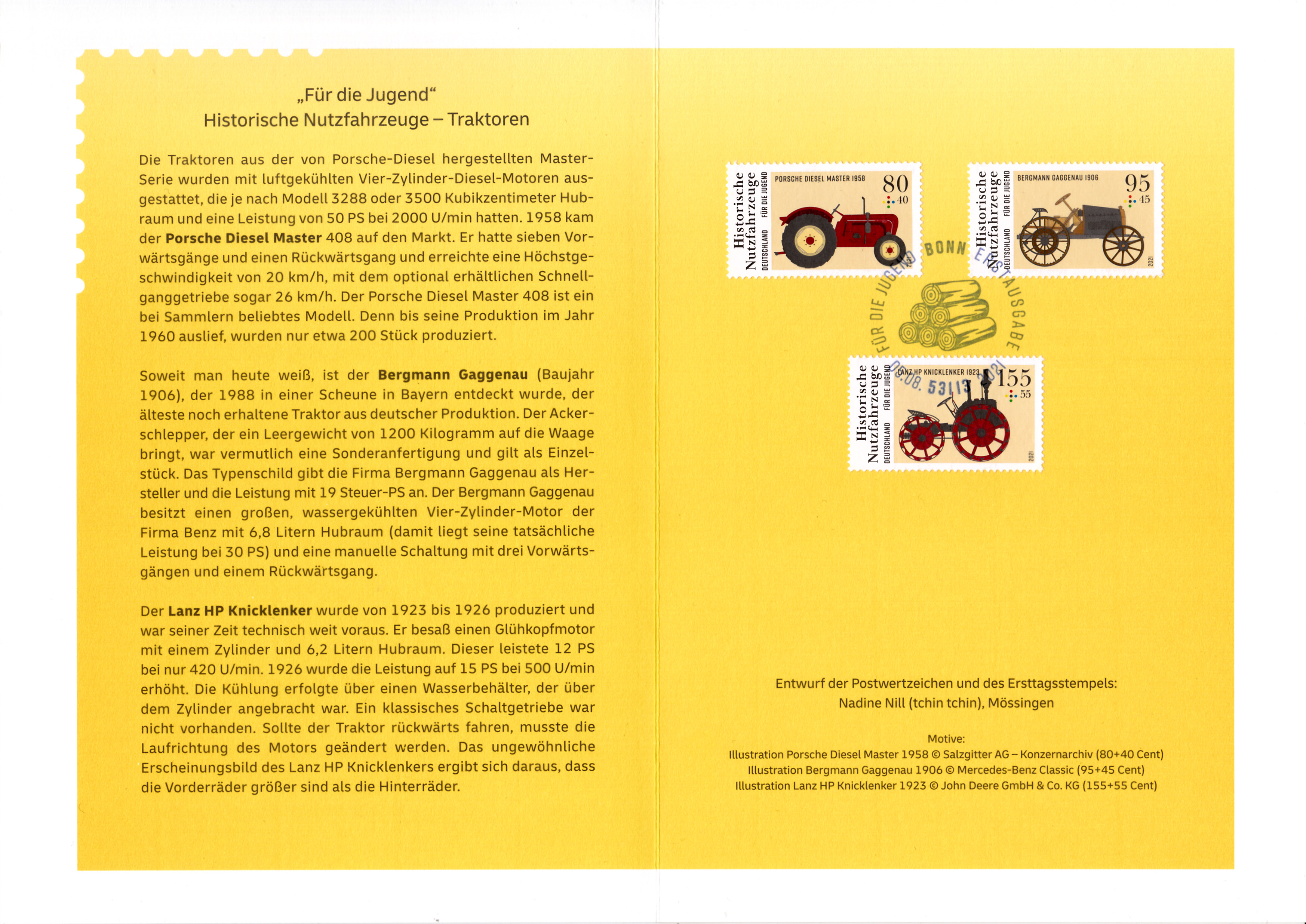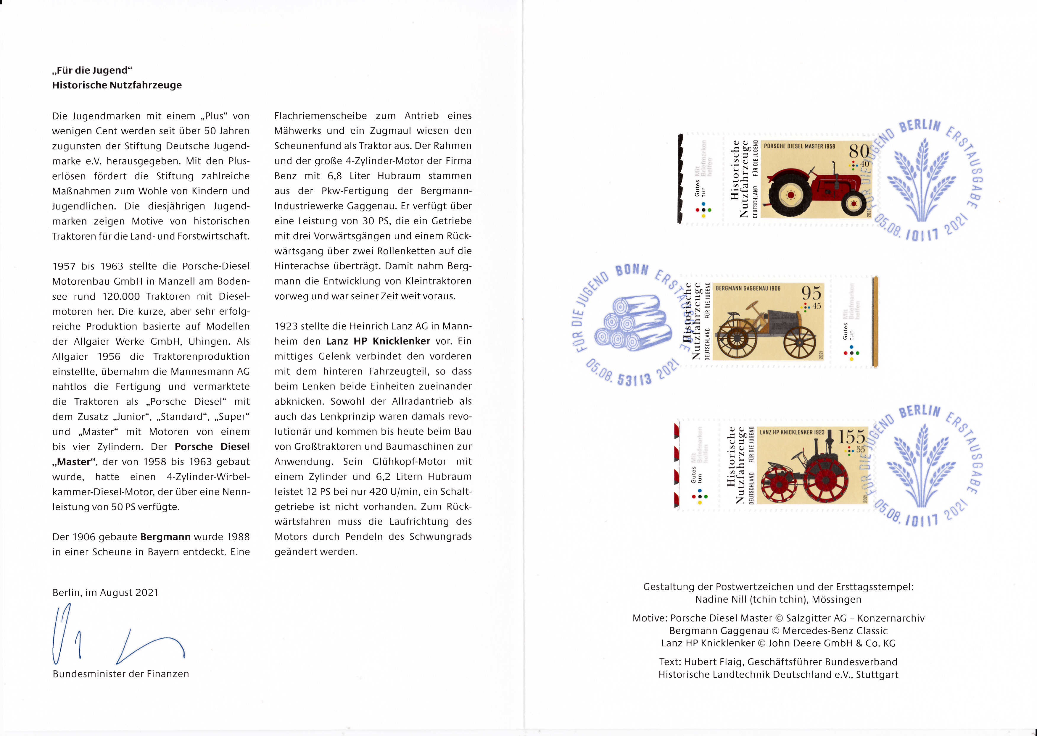 Ministerkarte des Finanzministers mit je einer Marke für die Jugend 2021 (MiNr 3618 bis 3620) mit Motiven zum Thema "Historische Traktoren". Zwei Marken sind mit den Ersttagsonderstempel Berlin gestempelt und eine Marke erhielt den Ersttagsonderstempel Bonn.