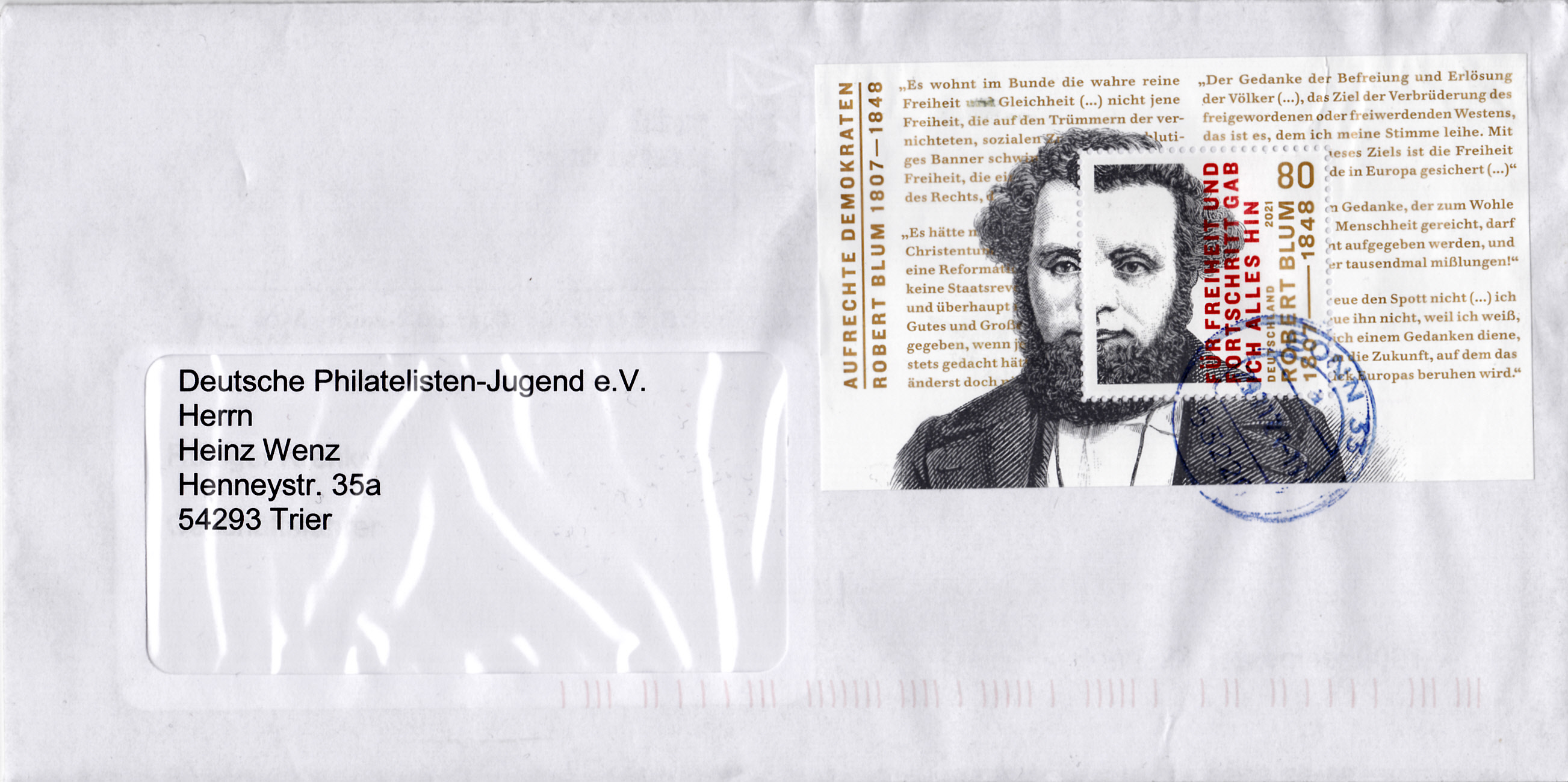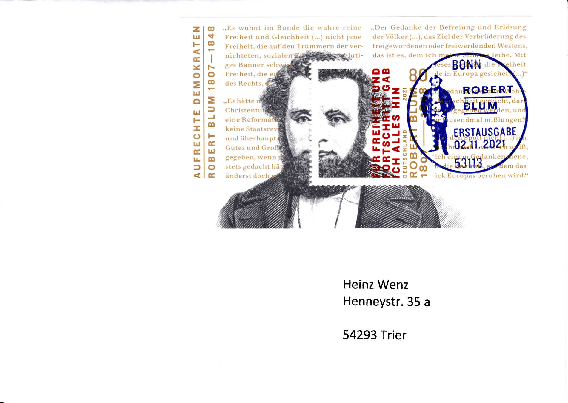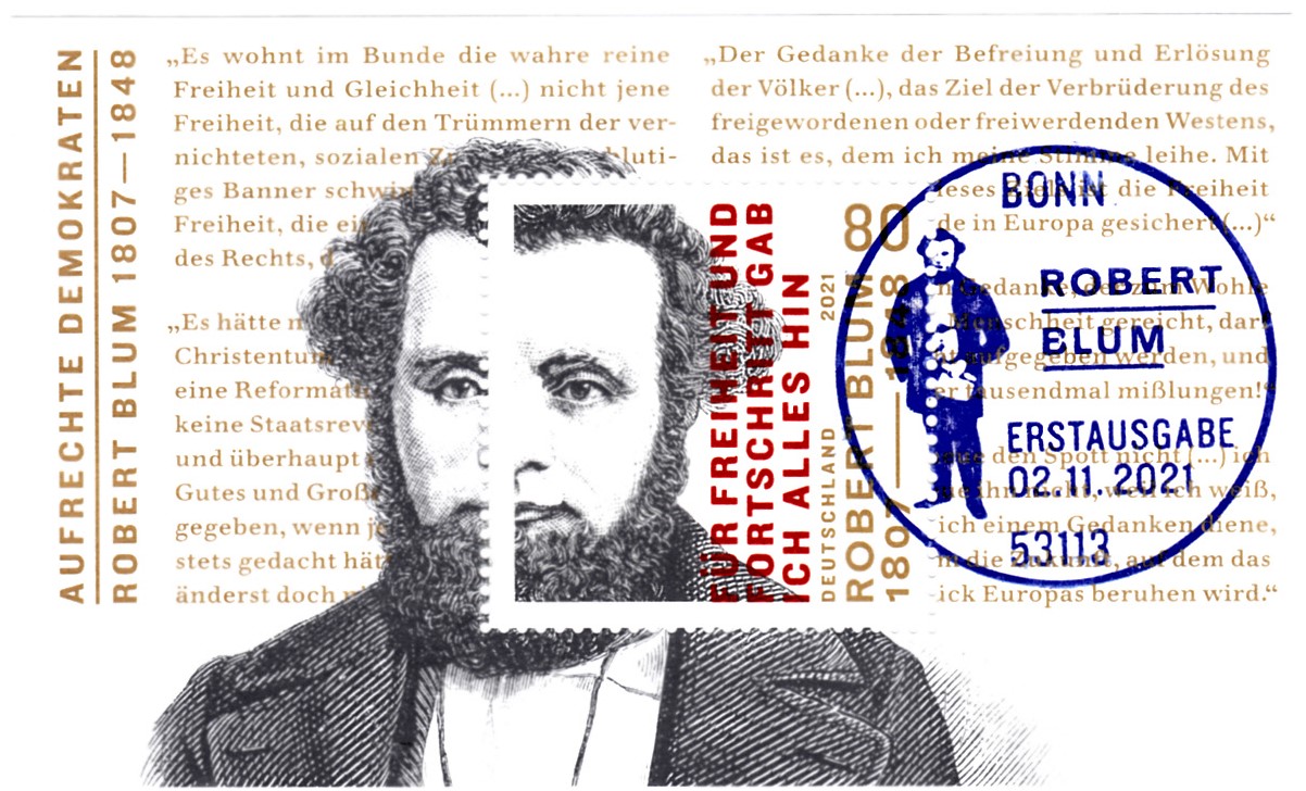 Ministerkarte des Bundesministers für Finanzen mit dem Block der Deutschen Post (MiNr Block 89 mit Marke MiNr 3637) aus der Serie "Aufrechte Demokraten" mit Robert Blum und dem Ersttagsonderstempel Berlin. Wegen der Bundestagswahl am 26.9.2021 gab es am Tag der Ausgabe der Marken im November nur einen "geschäftsführenden" Finanzminister. Die Ministerkarten tragen daher keine Unterschrift des Ministers.