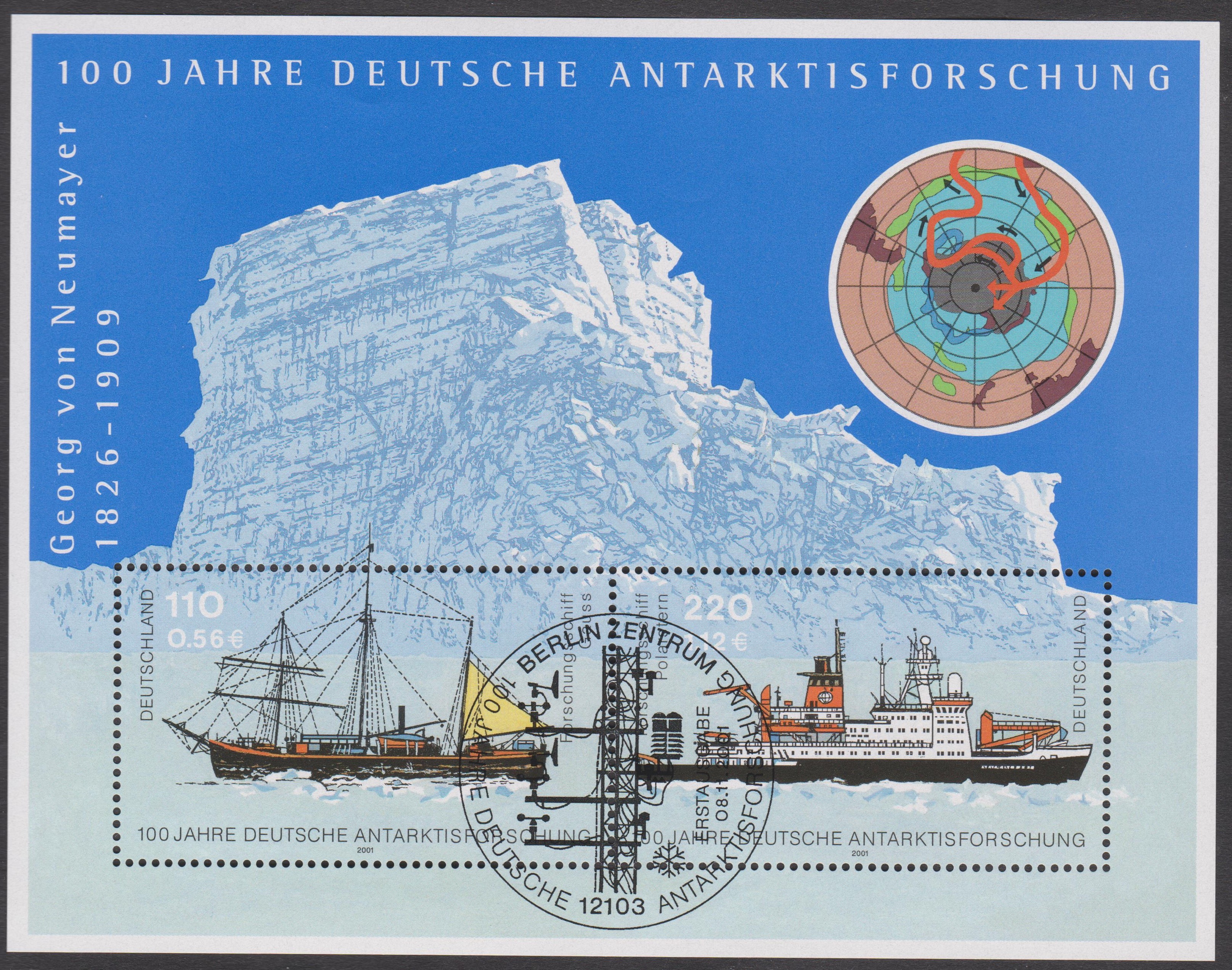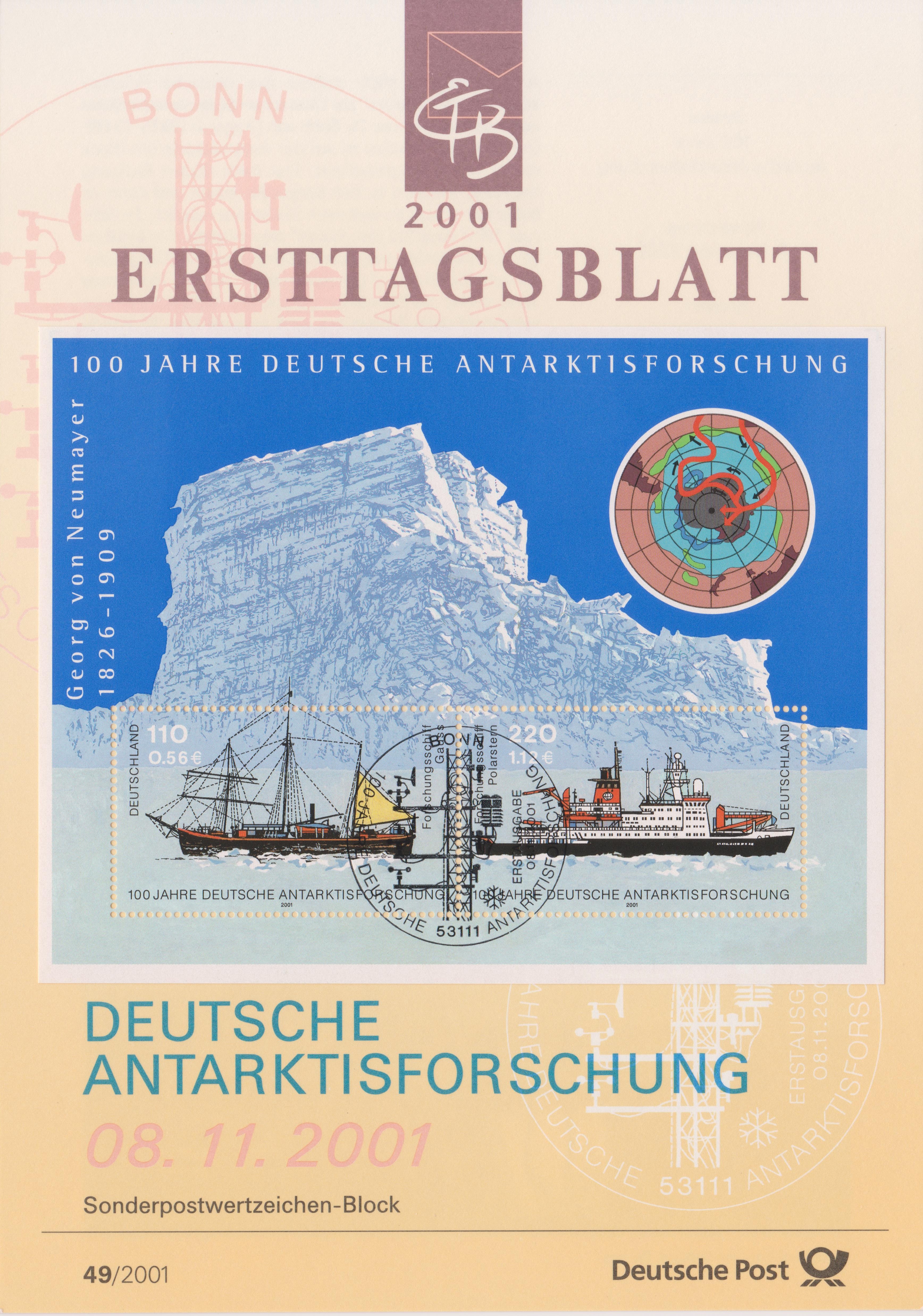 Block 57 erschien am 08.11.2001 zum Thema 100 Jahre deutsche Antarktisforschung. Er enthält 2 Marken, eine zu 110 Pf / 0,56 € Motiv „Forschungsschiff Gauss“ und eine zu 220 Pf / 1,12 € Motiv „Forschungsschiff Polarstern“.