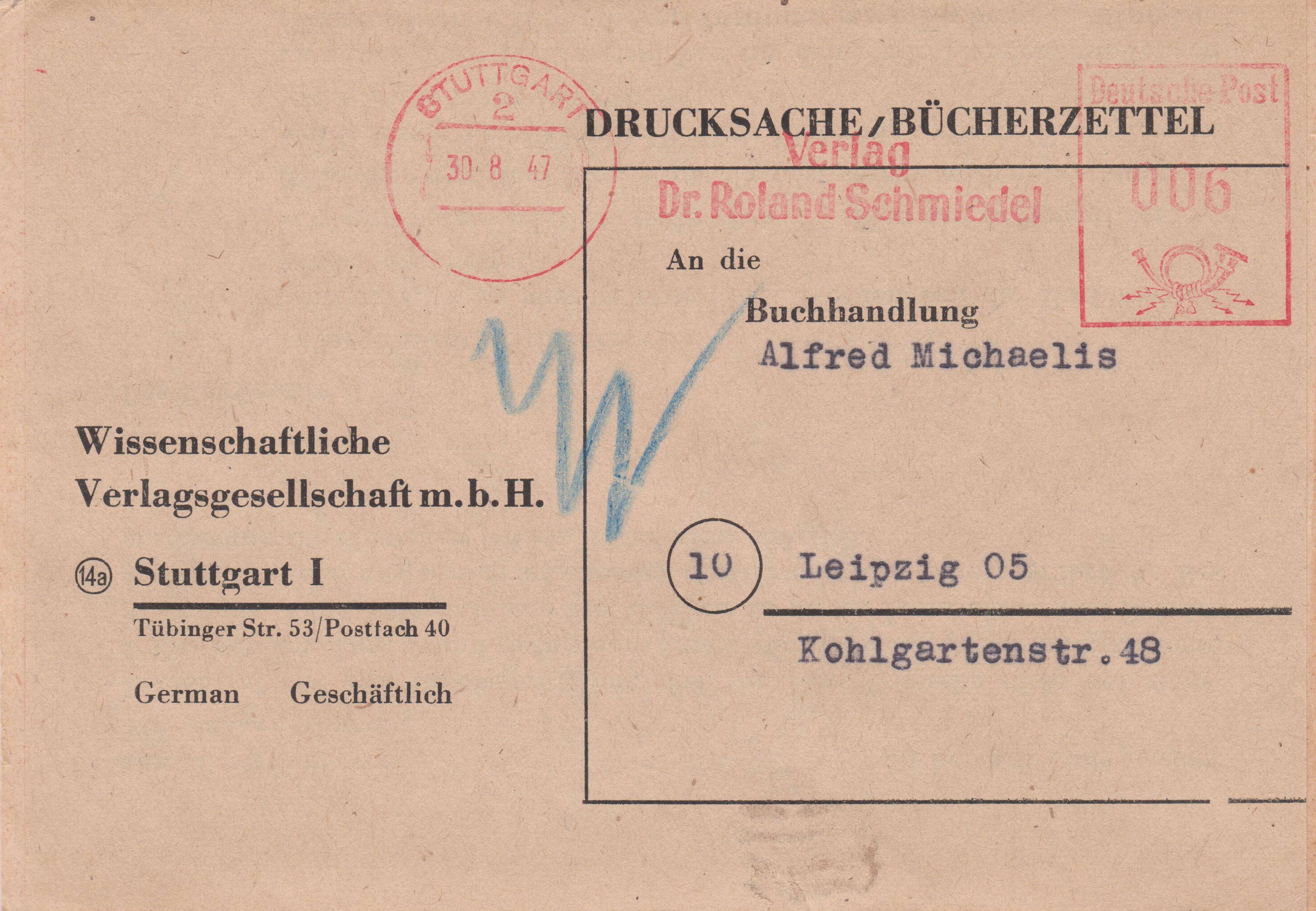 "DRUCKSACHE/BÜCHERSENDUNG", freigemacht mit 6 Pf per Absenderfreistempel STUTTGART 2 vom 30.08.1947, die Inschrift "STADT DER AUSLANDSDEUTSCHEN" wurde entfernt = "aptiert":