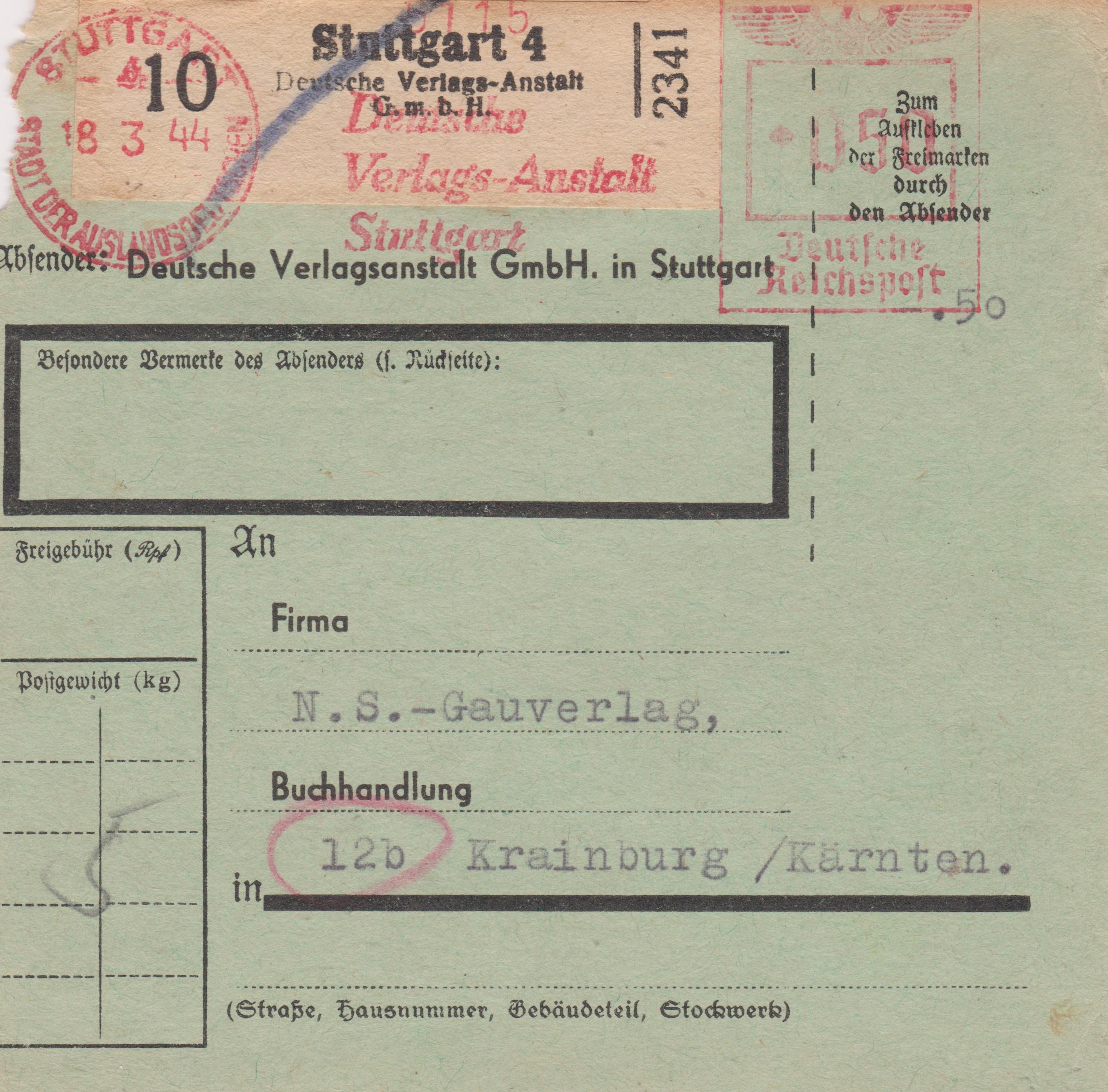 Postgutkarte über die Einlieferung eines Postguts mit einem Gewicht von 5 kg mit Absenderfreistempel der Wertstufe 050 Pf "Deutsche Verlags-Anstalt Stuttgart" mit Ortsangabe "STUTTGART 4 STADT DER AUSLANDSDEUTSCHEN" vom 18.03.1944: