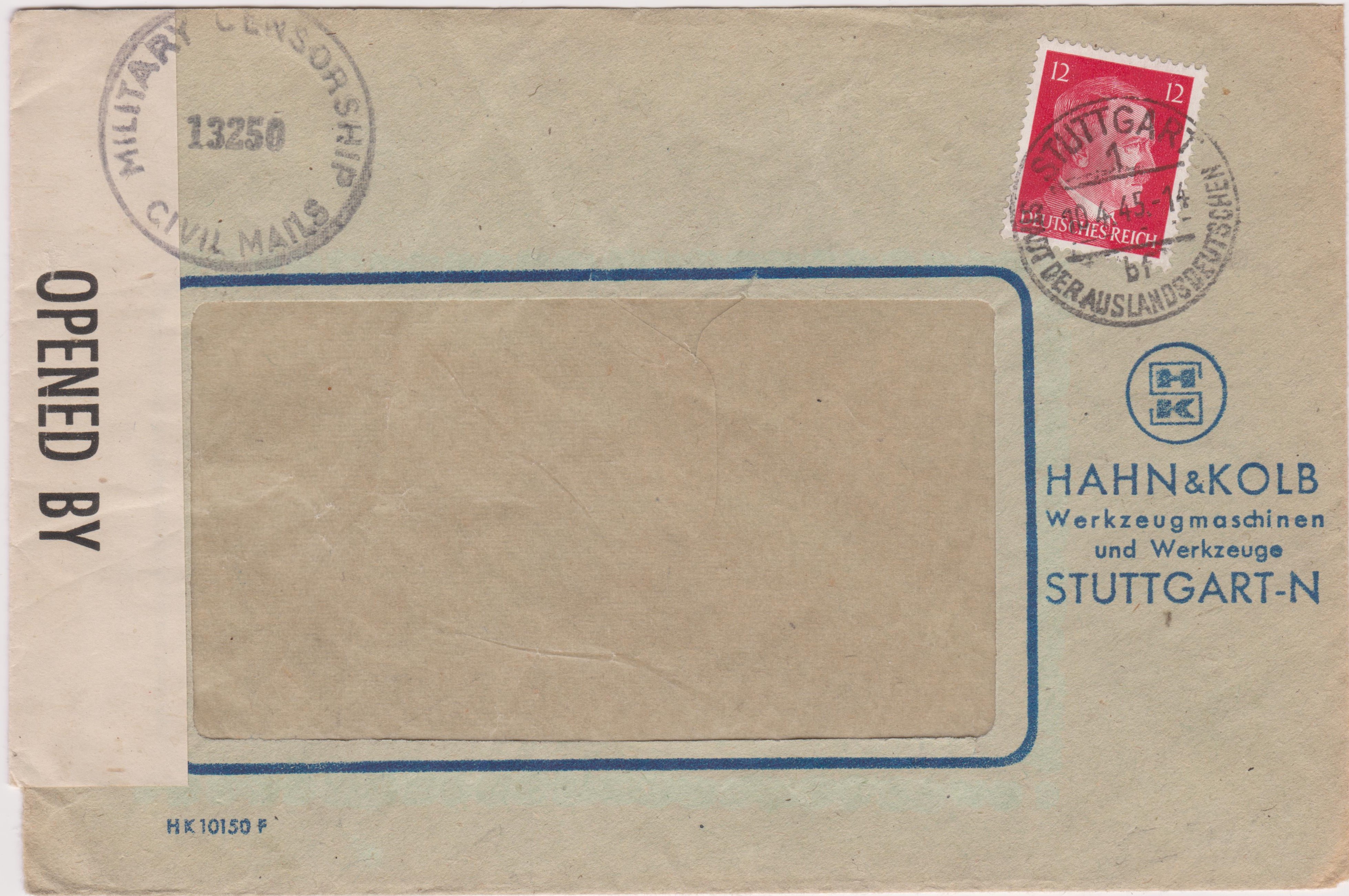 Einzelfrankatur 12 Pf entsprechend der Portostufe für einen Brief im Fernverkehr, entwertet am 10.04.1945 mit Tagesstempel "STUTTGART 1 bf STADT DER AUSLANDSDEUTSCHEN":