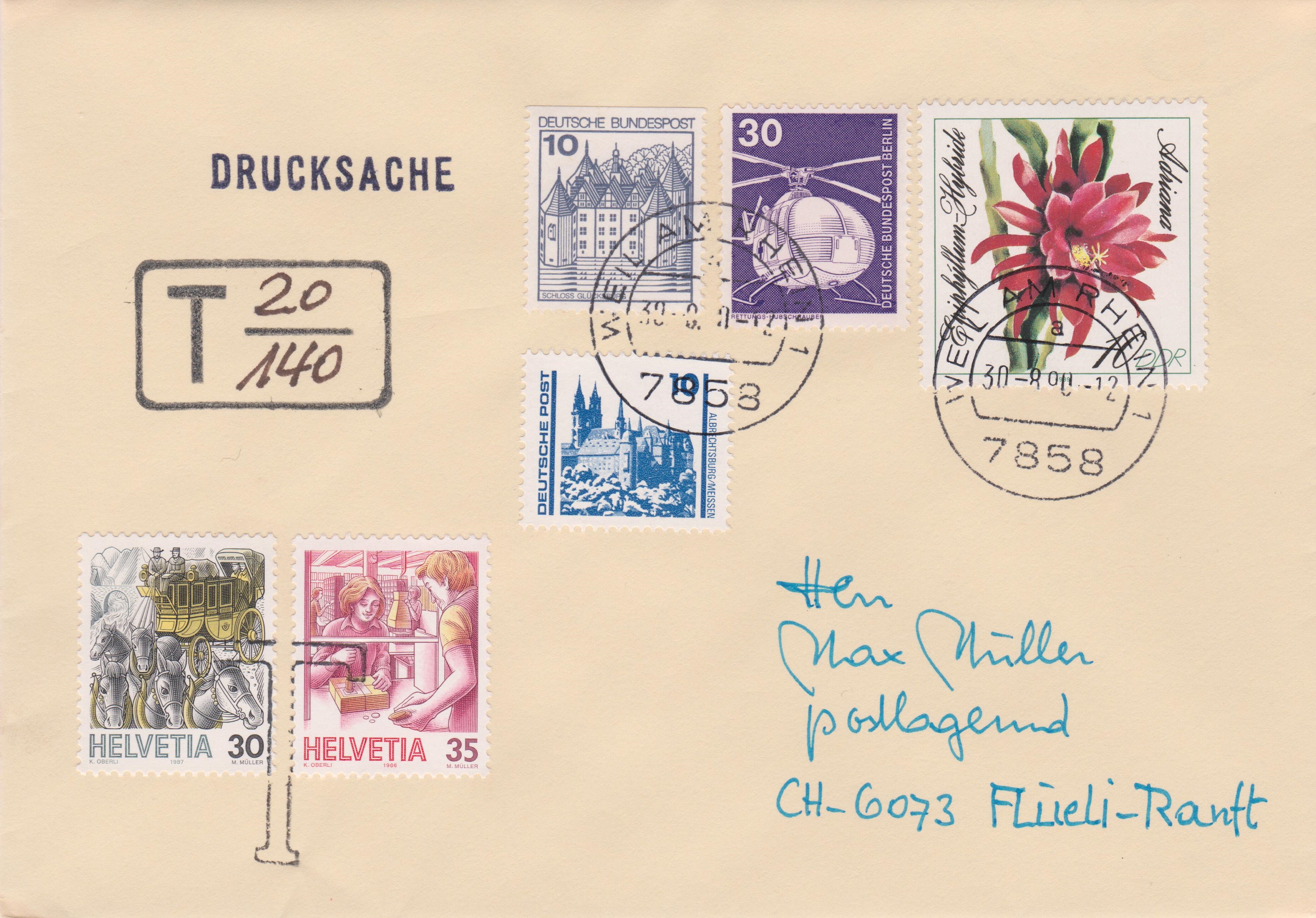 Eine Drucksache bis 20 Gramm in die Schweiz kostete am 30.08.1990 ein Porto von 80 Pf. Daher wurde ein T-Stempel abgeschlagen und als Zähler wurden die 20 Pf eingetragen, die bei dieser Drucksache als Frankatur fehlten. Als Nenner wurden "140" (Pf) als das zu diesem Zeitpunkt geltende Porto für einen Standardbrief ins Ausland eingetragen.