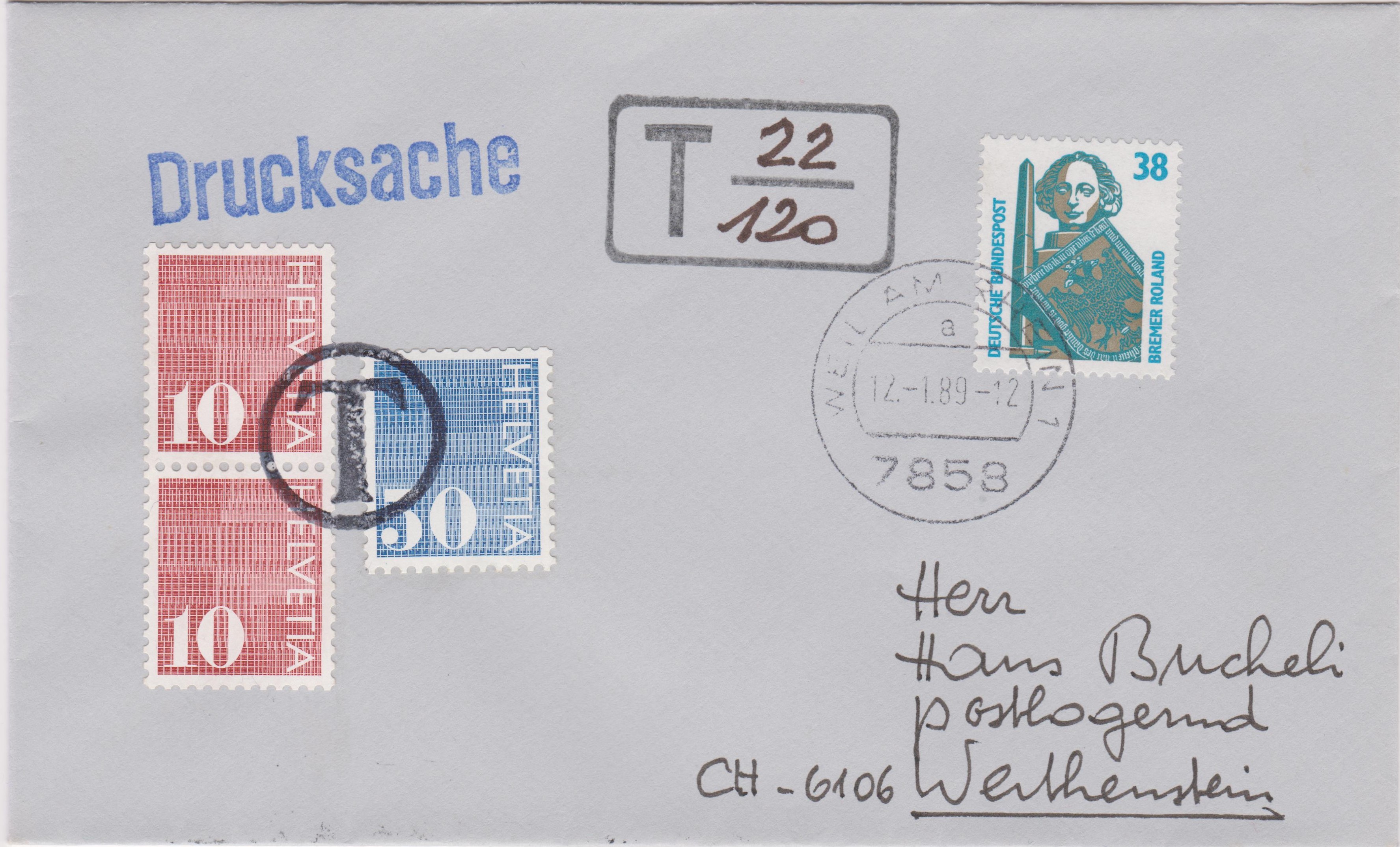 Eine Drucksache bis 20 Gramm in die Schweiz kostete am 12.01.1989 ein Porto von 60 Pf. Daher wurde ein T-Stempel abgeschlagen und als Zähler wurden die 22 Pf eingetragen, die bei dieser Drucksache als Frankatur fehlten. Als Nenner wurden "120" (Pf) als das zu diesem Zeitpunkt geltende Porto für einen Standardbrief ins Ausland eingetragen.