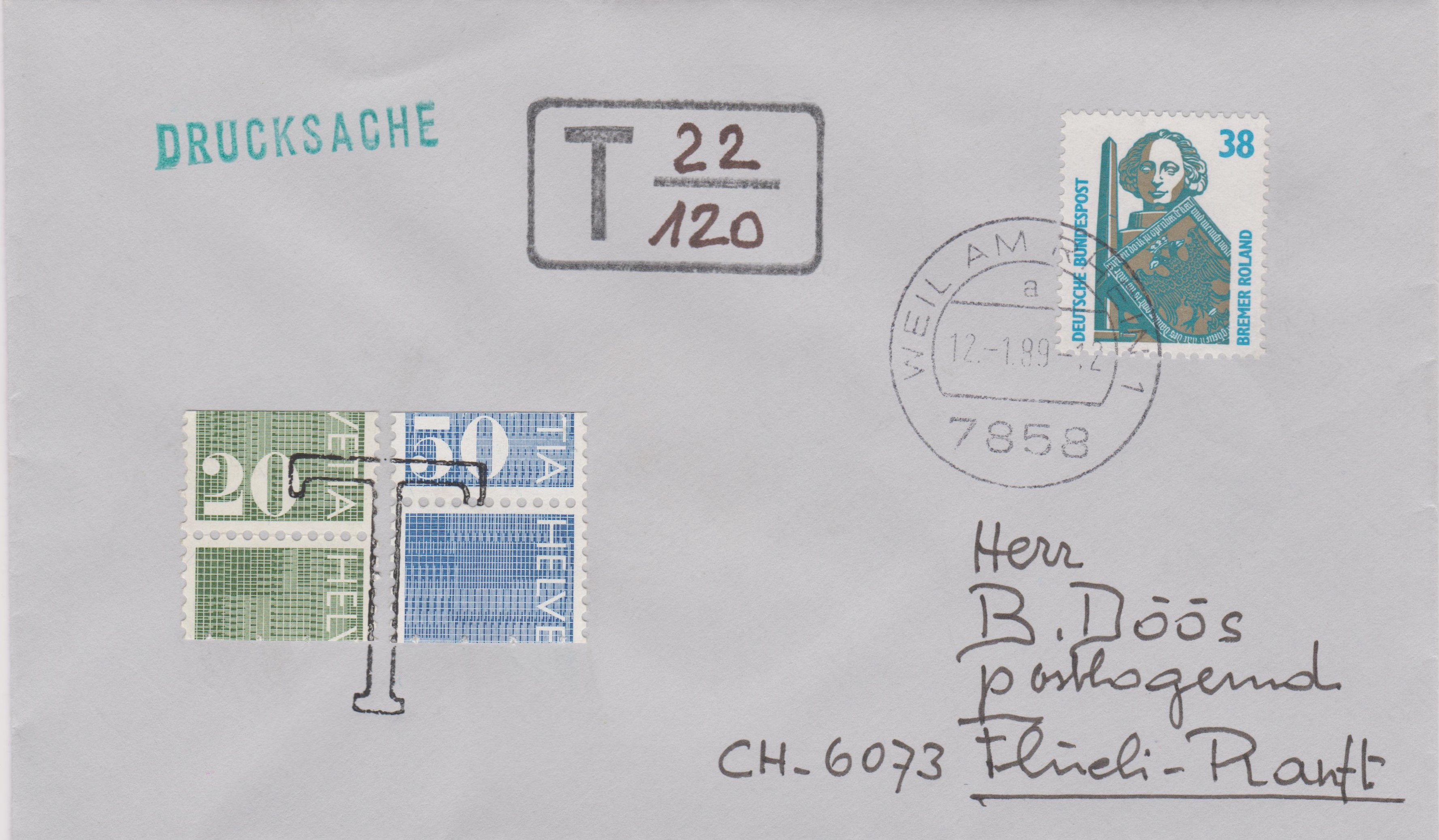 Eine Drucksache bis 20 Gramm in die Schweiz kostete am 30.08.1990 ein Porto von 80 Pf. Daher wurde ein T-Stempel abgeschlagen und als Zähler wurden die 20 Pf eingetragen, die bei dieser Drucksache als Frankatur fehlten. Als Nenner wurden "140" (Pf) als das zu diesem Zeitpunkt geltende Porto für einen Standardbrief ins Ausland eingetragen.
