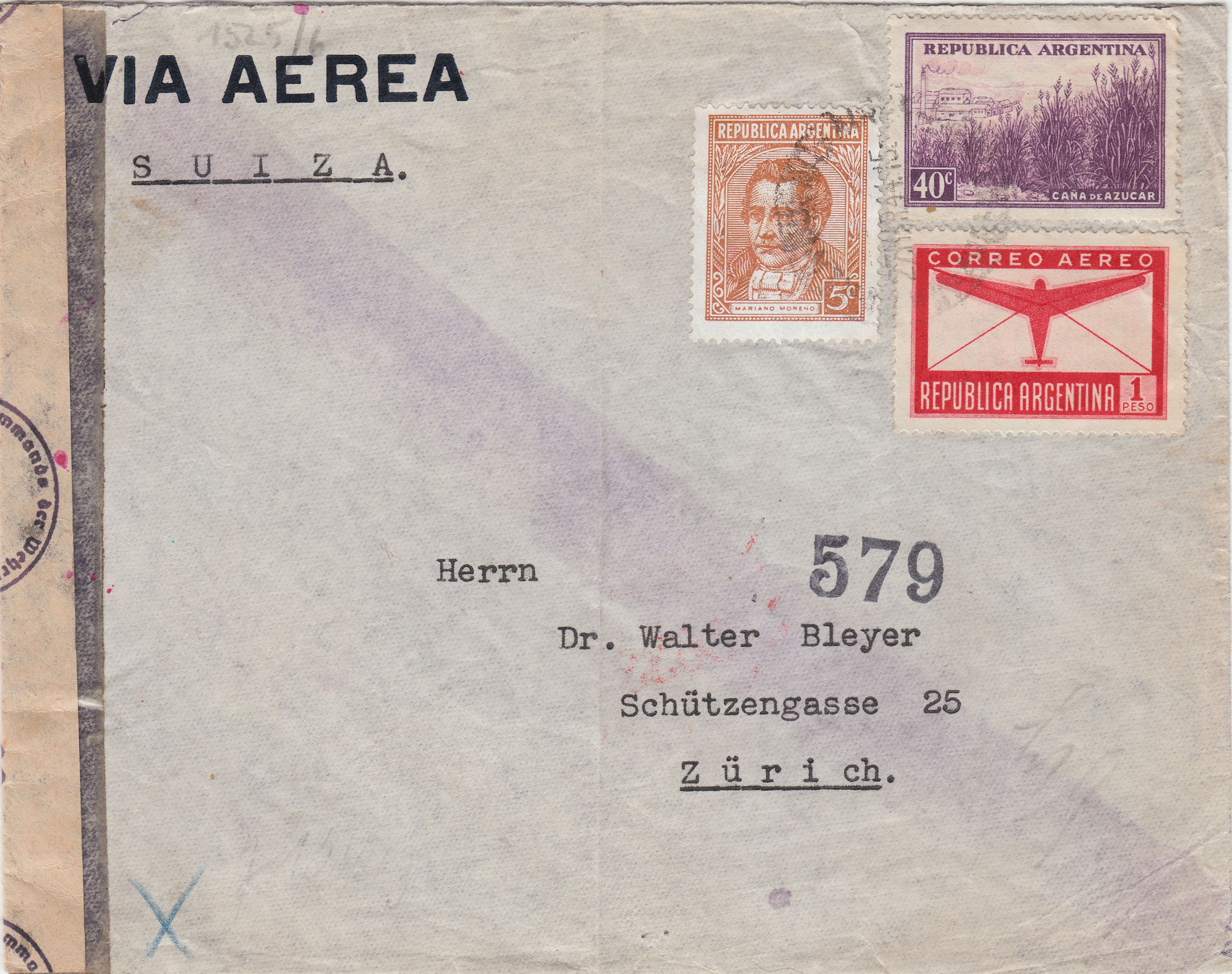 Dieser nach Zürich adressierte Luftpostbrief wurde am 27.03.1944 in Buenos Aires aufgegeben: