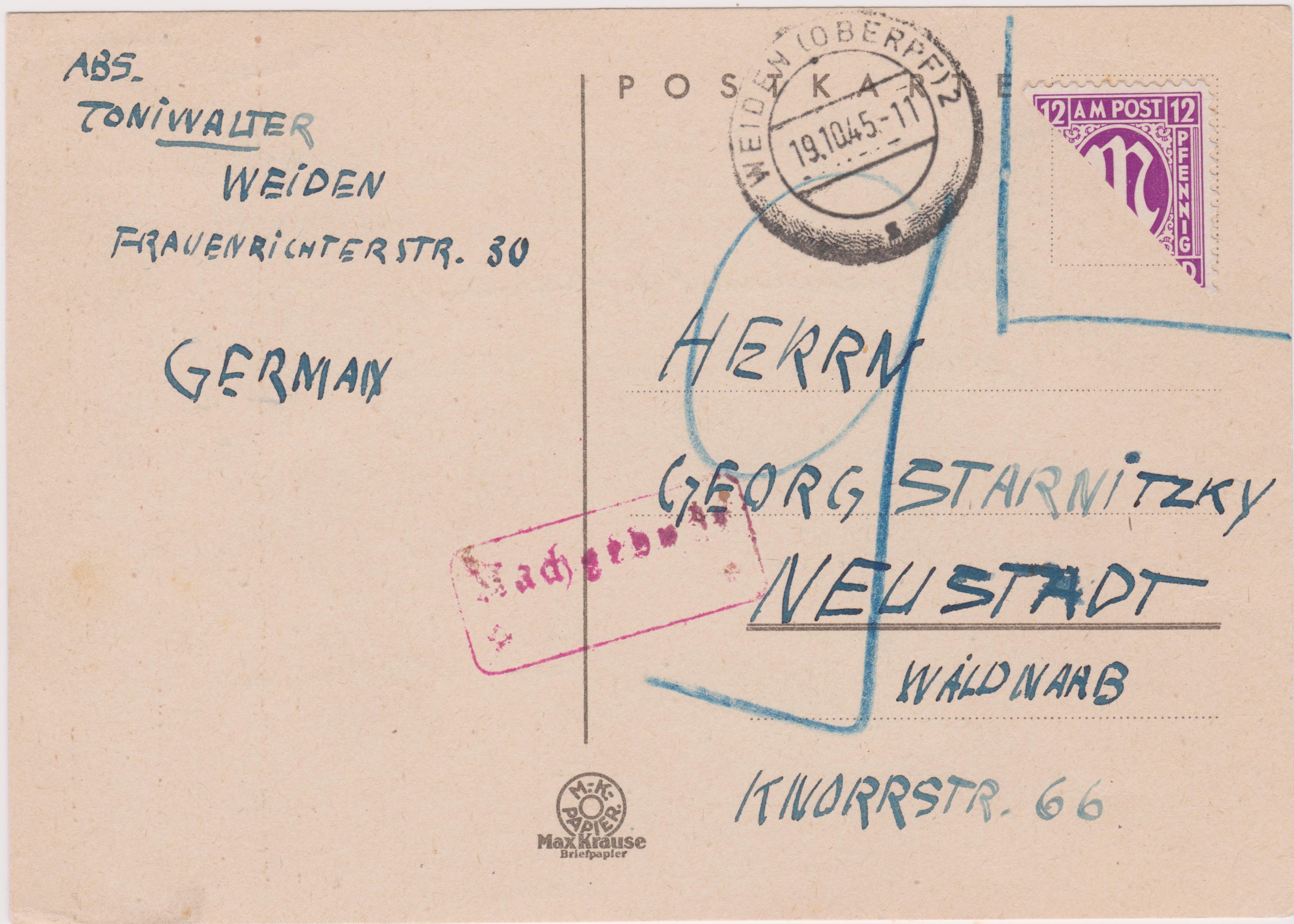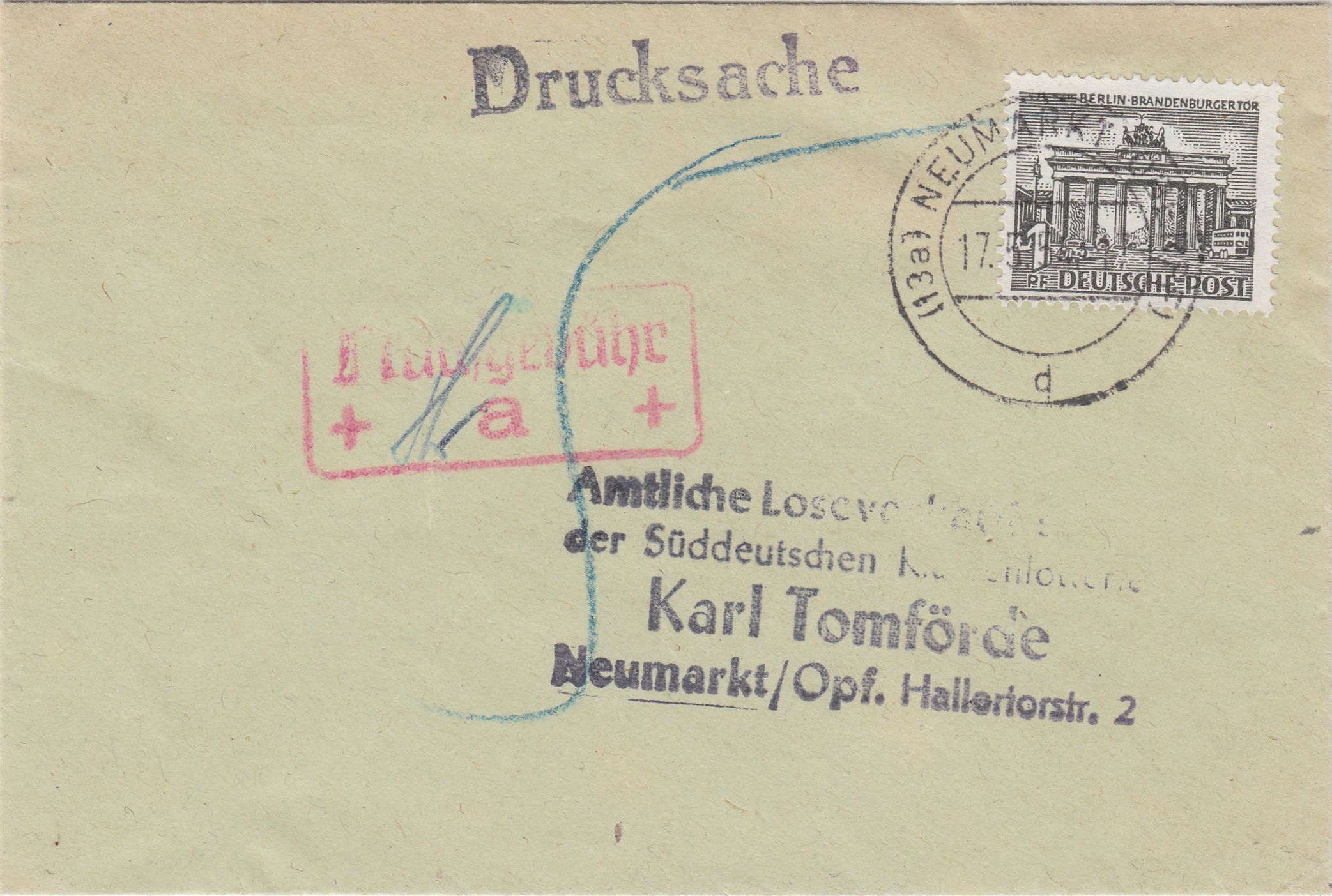 Die Post behandelte diese Sendung jedoch als Briefsendung! Ein Fernbrief von Berlin nach Zweibrücken kostete 20 Pf Porto.