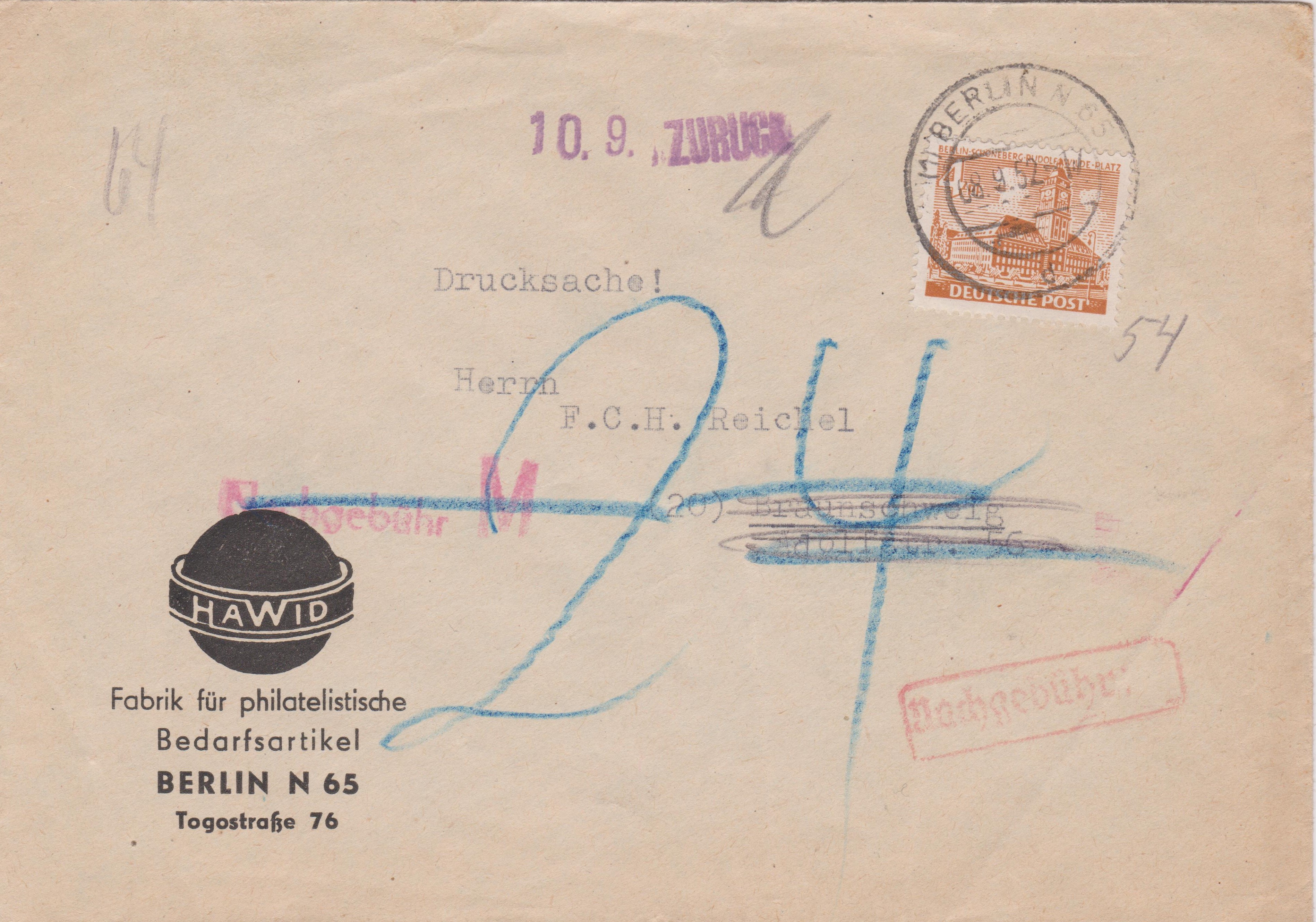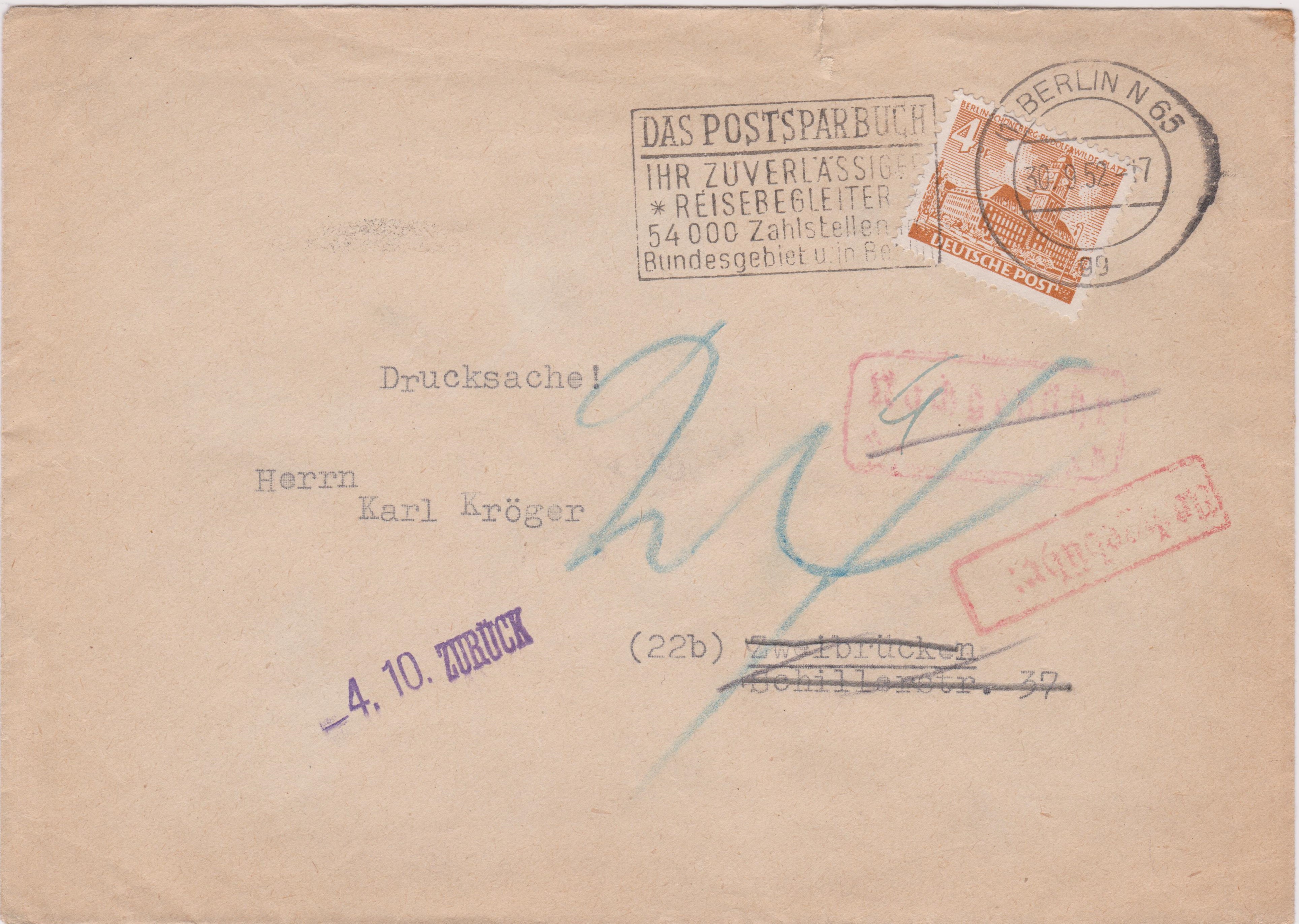 Diese am 30.09.1952 von "(1) BERLIN N 65" nach "(22b) Zweibrücken" verschickte "Drucksache" wurde als solche portogerecht mit 4 Pf frankiert.