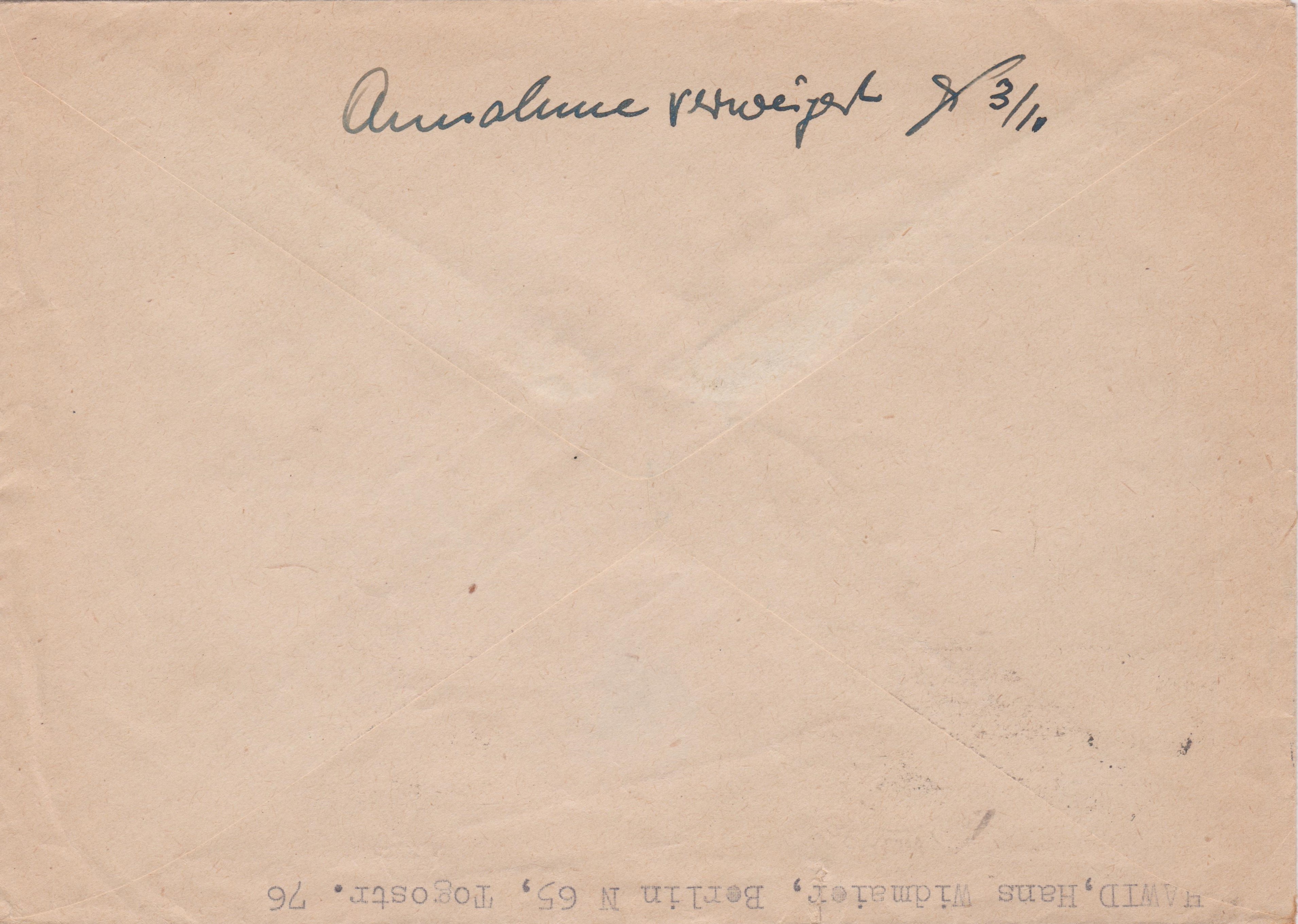 Laut handschriftlichem rückseitigem Vermerk "Annahme verweigert (Namenskürzel des Briefträgers) 3/10" verweigerte der Empfänger die Annahme der Sendung und diese ging somit an den Absender am "-4.10. ZURÜCK".